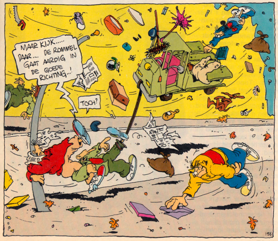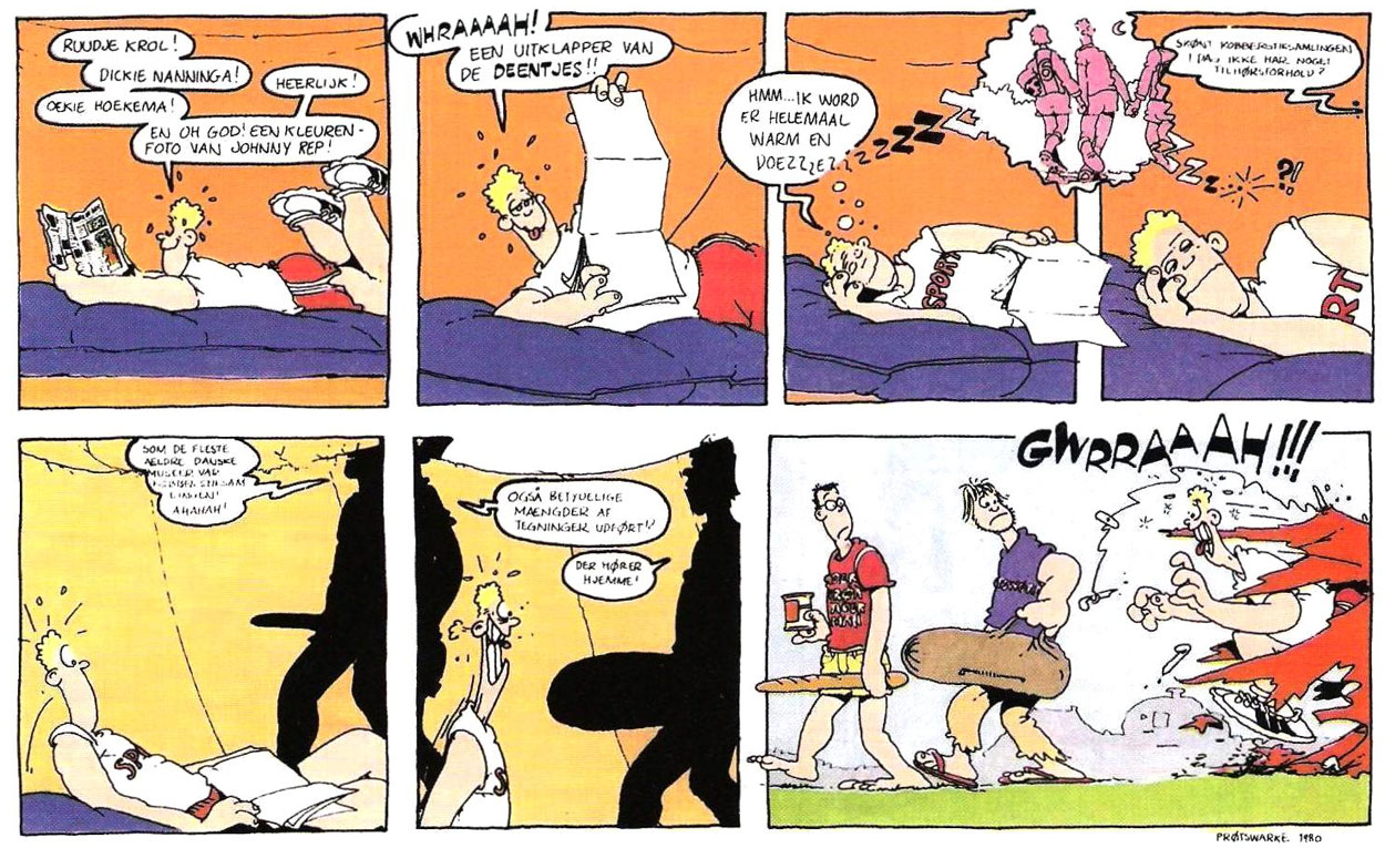 In the meantime, Prutswerk's alternative and satirical humor had also found its way to the adult-oriented comic magazine Gummi. Starting their contributions in issue #11 of 1978, the duo made a great many short stories throughout Gummi's run. Their main recurring character was 'Han Gewetensvim', a journalist with the A t/m Z Gazet. Its publisher is the shady businessman Toon Ladder, a precursor to Gerrit de Jager's later character of the same name. Leaning heavily on political references and the news of the day, Prutswerk's Gummi comics also had prominent roles for the politicians Dries van Agt and Hans Wiegel. After an unemployed man called Jeroen van Blerk is run over by a car, Toon Ladder convinces Van Agt to have him transformed into "The Ironic Man", a Frankenstein-like creature able to take down his enemies by making ironic remarks. The name 'De Ironische Man' was a nod to the "bionic man" cyborg from the TV show 'The Six Million Dollar Man'. In the story, the Ironic Man is sent to the World Championship Football in Argentina as a stand-in for the Dutch national team's star player Johan Cruyff. In real life, Cruyff indeed refused to join his fellow players, to protest the military junta of dictator Jorge Rafaele Videla.