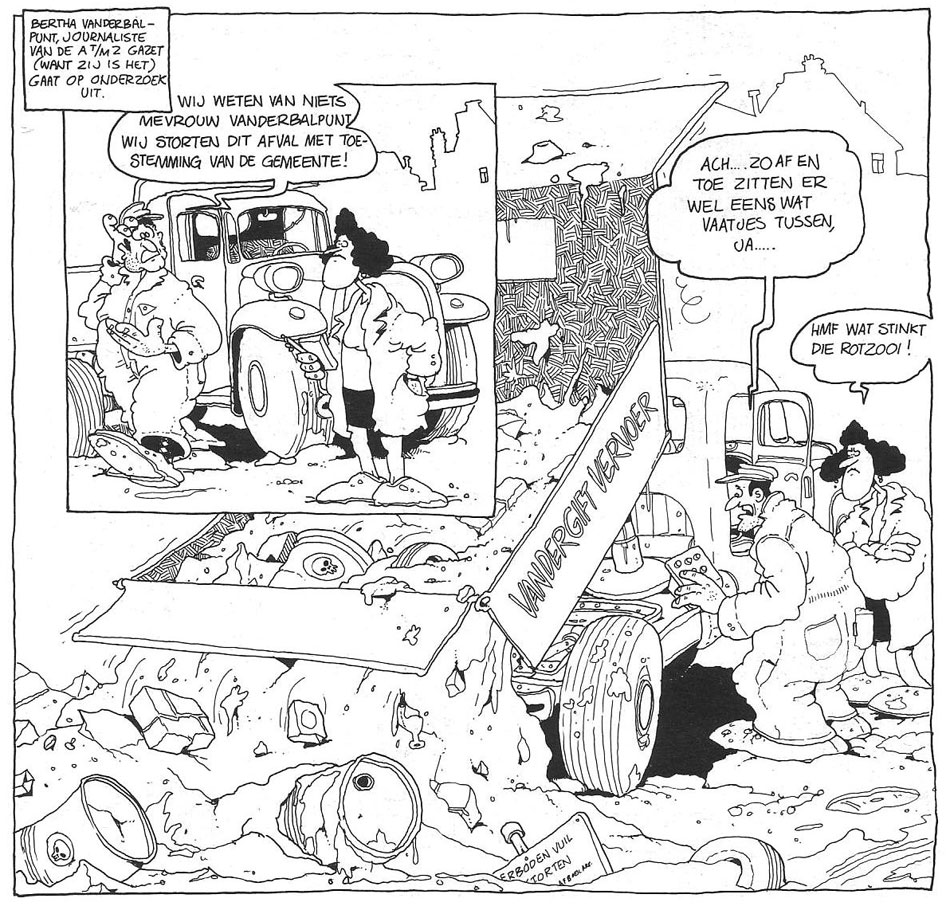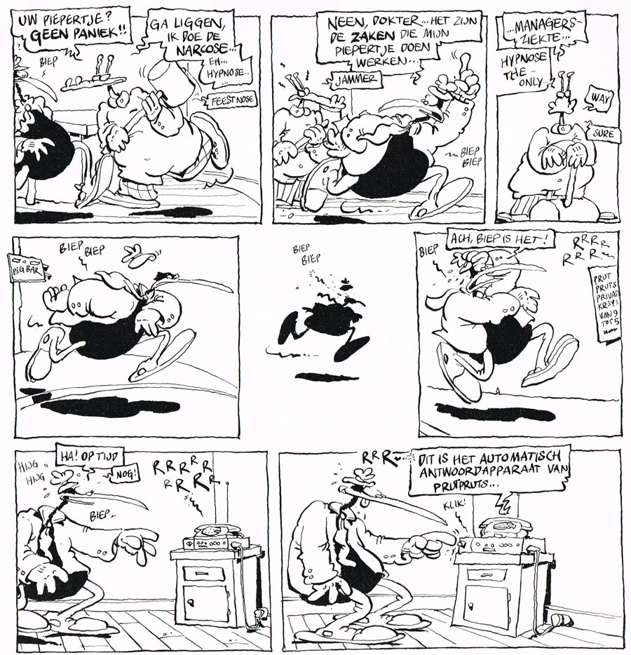 Through their work for De Vrije Balloen, the Prutswerk team was also introduced to more mainstream magazines. Starting in 1978, their comics appeared in the Malmberg children's magazines, which were distributed at schools. In Taptoe, they co-created the Sherlock Holmes spoof 'Sulle Hooms' (1978-1982), scripted by Patty Klein. In each episode, the brilliant detective presents the reader with a puzzle or whodunit tale, of which the solution could be found in the same issue, a few pages later. The series was quite a challenge, since the team had to come up with a weekly puzzle, present it in a narrative and top it off with a funny punchline. Taptoe's 1983-1984 volume introduced a new Prutswerk creation, starring the unlucky garbage man 'Bert J. Prulleman' (1983-1984). This was however largely a Stevenhagen solo production, as the Prutswerk partnership had broken up by then. The series spawned three albums, published by Espee. In the late 1970s, the Prutwerk team also provided artwork to Malmberg's pre-school magazine Primo.