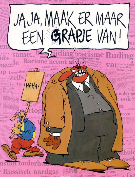 After the break-up of Prutswerk, De Jager settled upon a stylized graphic style which more and more appealed to a large mainstream audience. Stevenhagen, on the other hand, further developed the more gritty and cartoony underground style of their early collaborations, recognizable for its characters with big feet, thick legs and relatively thin heads, as well as much graphic mayhem in the panels. As he initially continued some of the early Prutswerk creations - 'Bert J. Prulleman' in Taptoe and 'Han & Hanneke' in De Waarheid - he gradually shifted towards political satire and commissioned comics, cartoons and illustrations for mostly clients with a social or political engagement.