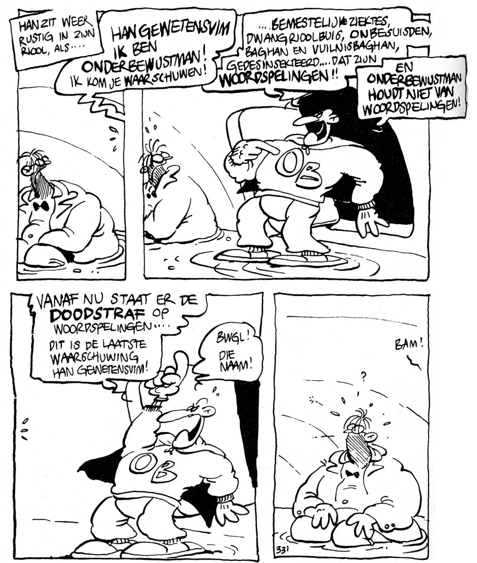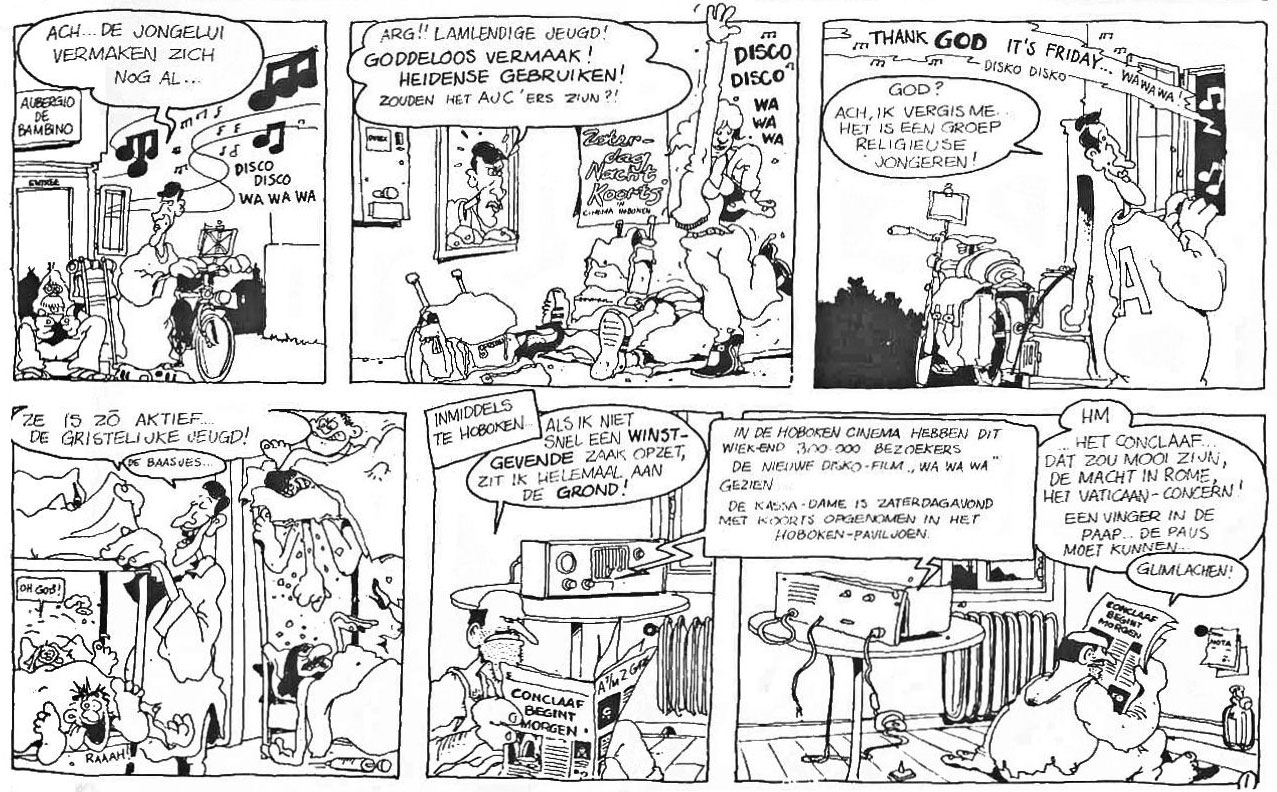 A socially conscious political satire, the comic referenced Elvis Presley's death, the smallpox eradication, the Lebanese Civil War, the 1978 papal elections and the murder of Bulgarian dissident Georgi Markov with a poisoned umbrella. Real-life politicians received cameos, like the aforementioned Videla, but also Dutch Prime Minister Dries van Agt, Vice Prime Minister Hans Wiegel, Cuban dictator Fidel Castro and NATO secretary-general Joseph Luns. In 1980, 'Han Gewetensvim' was published as a comic book by Espee. Despite being very self-referential, instantly dated and uncompromisingly Dutch, two four-story episodes were translated into French by Yvan Delporte and printed in (À Suivre) magazine in 1978-1979.