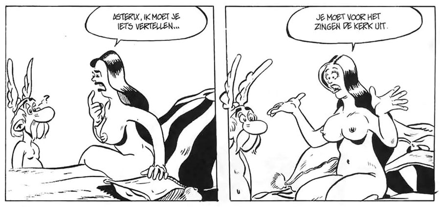 During their association with Espee, De Jager and Stevenhagen also participated in group projects. Together, they wrote the script for 'Rammérix, Le Condôme', a porn parody of René Goscinny and Albert Uderzo's 'Astérix'. Published anonymously by Espee in 1982, the book was part of the 1980s wave of sex parodies with famous comic heroes. In the spoof, the Gauls discover they are out of condoms, inspiring Asterix and Obelix (here named Rammérix and Onanix) to travel to Rome to get new ones. On their trip, they have various sexual escapades, visit a Chinese restaurant in Lutetia and cause mayhem at the Lourdes pilgrimage site. However, Onanix isn't allowed to have sex, because he fell into the cauldron when he was young. This doesn't prevent him from having menhir-sized erections. The parody also featured a lot of meta humor, for instance when the characters complain about the nonsensical plot and "lack of enough sex scenes". 'Rammérix' is sometimes confused with two other 1982 'Asterix' porn spoofs, namely 'Asterix de Geilaard' and 'Asterix op de Walletjes' (both by De Bokken, 1982), signed by AVE. Out of fear of legal trouble, 'Rammérix' was produced in secret, even without using a pseudonym. The first page was drawn by Bert Tier, who then passed the pencil to Willem Vleeschouwer and Stevenhagen to finish the rest of the story. Aad Labadie was possibly also a contributor to the book. The book was released by Espee in collaboration with a "prestigious Dutch publisher who wanted to remain anonymous." After half of the books had been sold, the publisher suddenly changed his mind and destroyed the rest of the stock.