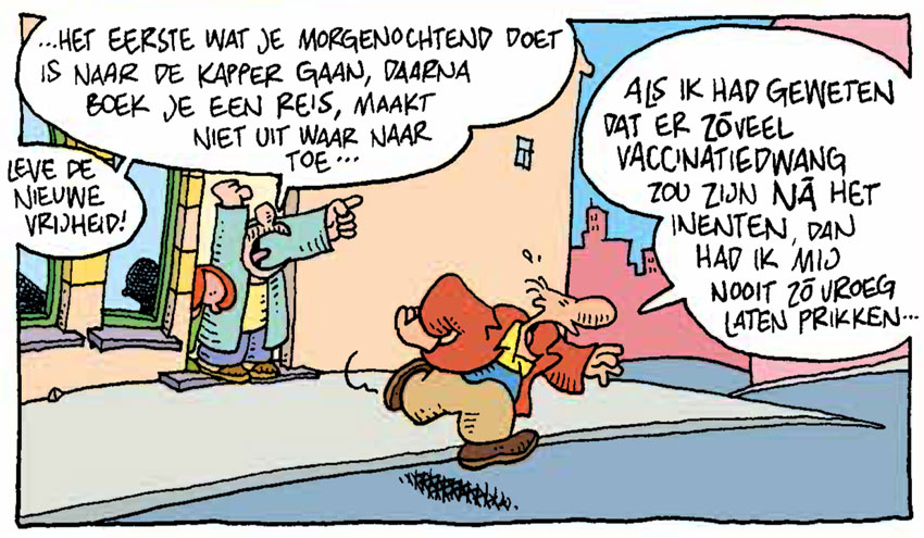During the remainder of the 1980s and the 1990s, Stevenhagen and De Jager occasionally worked together, for instance on their weekly three-page comic section 'De Nieuwste Revu' (1985) in Nieuwe Revu. For the newspaper De Volkskrant, they made a new installment in the collective series 'Hollands Drama' (1991). An early adapter in using Photoshop in his production work, Stevenhagen was also the digital colorist for De Jager and Philippe Bercovici's 1990s gag comic 'Eva en Adam'. Their final collaboration was a 1997 three-page comic for De Nieuwe Revu made in the light of Princess Diana's recent death: 'Diana & the Royal Dwarfs'. Around the turn of the century, Stevenhagen relocated to the province of Limburg, after which the two old friends lost sight of each other. Since 2021, Stevenhagen has been living in France.