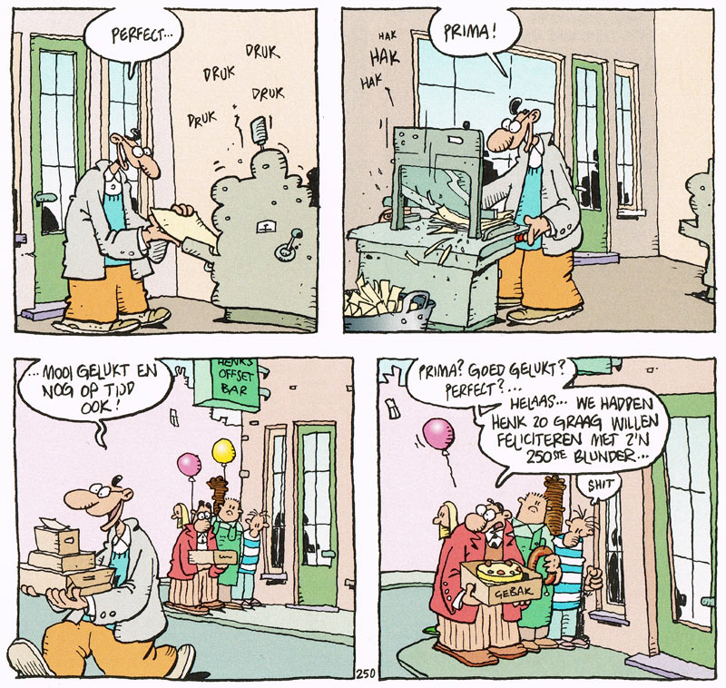 During the first years of their professional careers, Stevenhagen and Gerrit de Jager remained an inseparable duo, working under the collective name "Prutswerk" (Dutch for "shoddy work") as a sort of Lennon-McCartney of comics. Their ironic pseudonym referred to their working methods. Since they had to whip out so much artwork on deadline, they divided the workload. Officially, Stevenhagen sketched out the pages, since he was better at doing lay-outs, while De Jager did the finished art with pencil and ink. However, this wasn't an ironclad law: if one of them was unavailable, the other filled in. Their artwork was barely distinguishable, except for a few specialties. Stevenhagen, for instance, enjoyed drawing cars more. At first, the duo was concerned that they didn't slave away on their pages, compared with professional cartoonists. Feeling obliged to fill up their panels, they started adding more background details, like thumbnails on the floor. These latter objects turned into a running gag. Initially, the duo considered organizing a Prutswerk studio to raise the production value, bringing in as extra contributors fellow Rietveld students like Paul Schindeler, Marianne Hoogstraten and Fay Luyendijk (who later became known as a musician under the name Fay Lovsky). Stevenhagen even rented a studio space in Amsterdam's Bijlmer district. However, they quickly realized they were better off as a two-man team, since they instinctively understood each other and their time-saving graphic methods were quick, efficient and had more character.