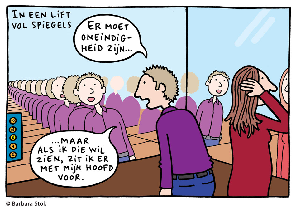 Cartoon for NRC. "In an elevator full of mirrors" "There must be infinity." "But if I want to see it, my head gets in the way."