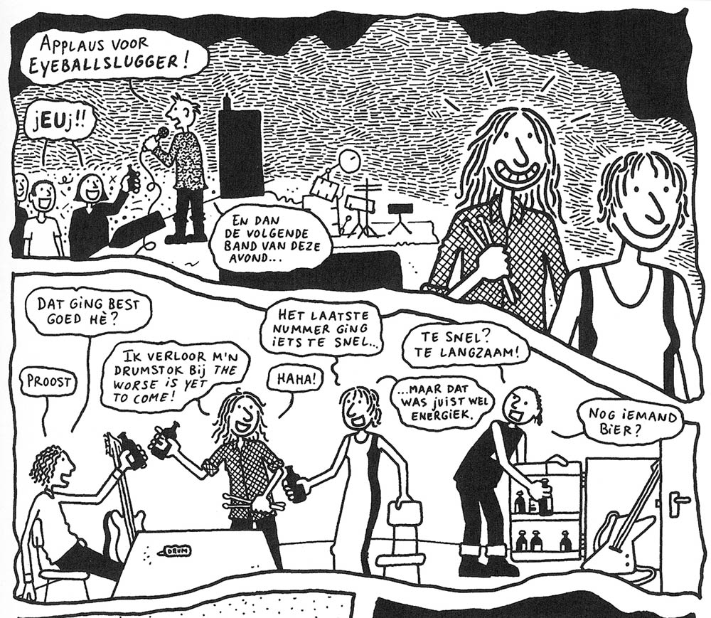 Back in the Netherlands, Stok tried to enroll at the School for Journalism, but was eliminated by lottery. In 1991, she tried studying Photography in The Hague instead, but dropped out after one year, as she wanted to be part of Groningen's rock music scene. Her homebase became the pop cultural center Vera, for which she had made drawings since her student days. Besides attending punk rock concerts there, Barbara Stok also performed as a drummer in local bands like Epigoon Kitchen, Eyeballslugger, Txotxo and De Hockeyrokjes. During daytime, she was a journalist/photographer at Hazewinkel Pers, working with a small team to fill five free local newspapers from the Groningen region. A stressful job that required her to work many hours, she found some relaxation in drawing. Around this time, Stok discovered American independent comics. Particularly Joe Matt's autobiographical comic book series 'Peepshow' inspired her to make her own comics, based on her everyday life. Among Barbara Stok's other graphic influences are Robert Crumb, Aline Kominsky, Daniel Clowes, Julie Doucet and Peter Bagge.