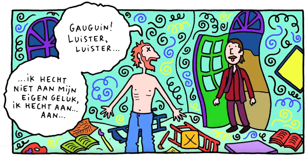 Outside the realm of autobiographical comics, Stok has explored the lives of historical persons in graphic novel format. In 2009, the Van Gogh Museum in Amsterdam asked her to make a graphic novel about the Dutch post-impressionist painter Vincent van Gogh. Combining her trademark minimalistic drawing style with Van Gogh's expressionism, Stok's biography dealt with the final years of the artist's tormented life, which he spent in the south of France. Published to much critical acclaim by Nijgh & Van Ditmar, the graphic novel 'Vincent' (2012) was translated into 20 other languages, including English, German, Greek, Spanish and Chinese. 'Vincent' was the first in a wave of Dutch graphic biographies of classic painters, commissioned by cultural institutions. Stok's book was followed by Typex's graphic novel about Rembrandt Van Rijn (2013), made for the Rijksmuseum, and a 2015 graphic novel by Marcel Ruijters' about Hieronymus Bosch, an initiative of the Jheronimus Bosch 500 Foundation. For the Groninger Museum, Stok herself moved on to create 'De Omslag' (Nijgh & Van Ditmar, 2015), a graphic novel about the Dutch artist, typographer and printer Hendrik Werkman (1882-1945).