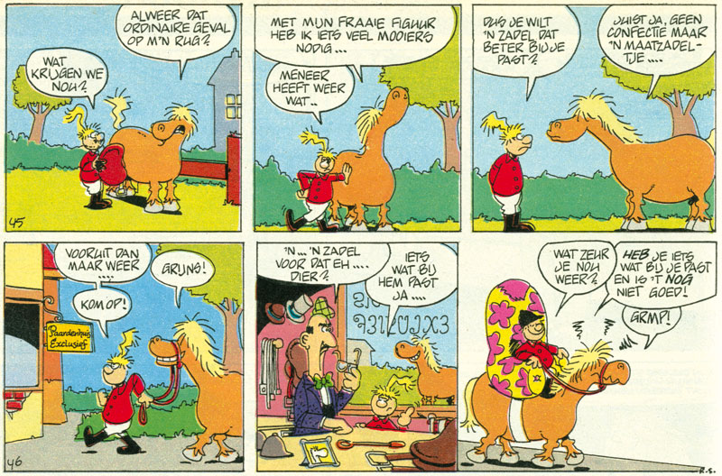 In 1984 the girls' magazine Tina became another important client for Ruud Straatman. For many years, he provided the magazine with 'Pien en Peer' (1984-1993), a gag strip about a young girl and her chubby talking horse. While he drew these strips himself, he provided scripts to about 40 dramatic short stories with artwork provided by the magazine's main supplier of that time, the Spanish Creaciones Editoriales agency. Nine of these stories featured the horse 'Miskoop' (1988-1992), and were drawn by María Barrera.