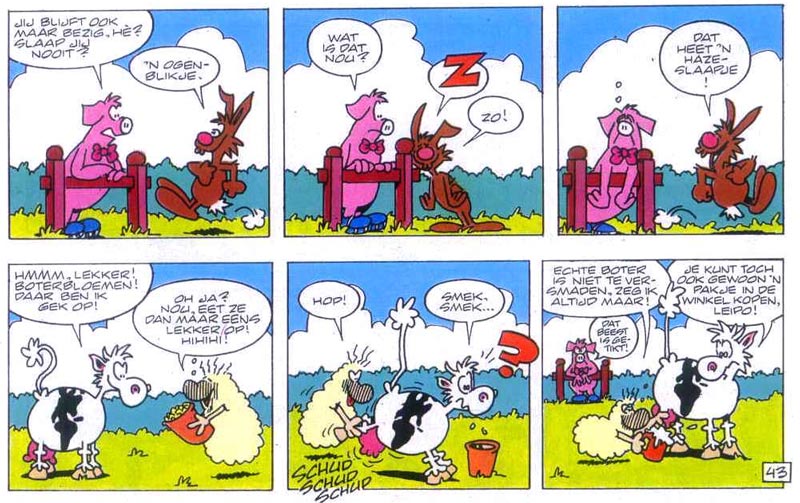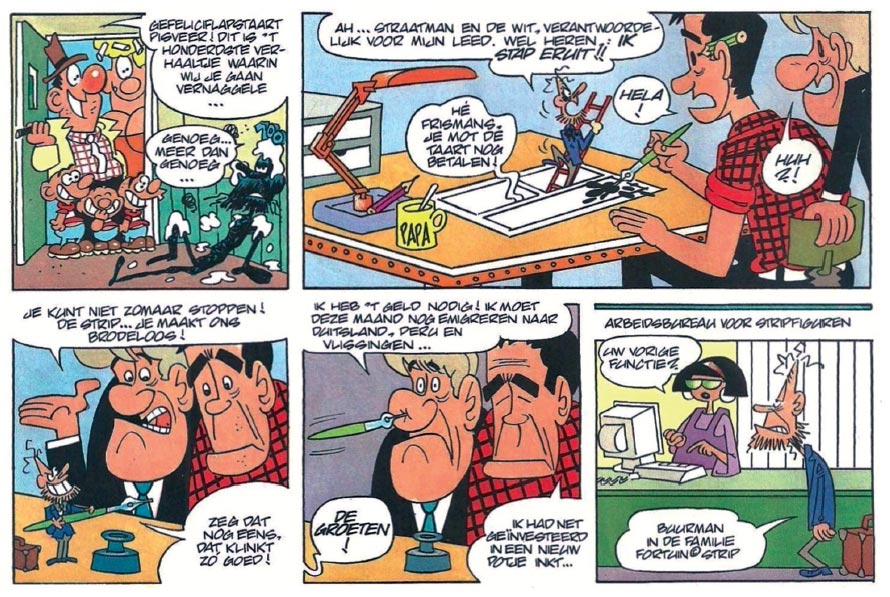 Besides 'De Familie Fortuin', Ruud Straatman worked on several other comics for Eppo/Wordt Vervolgd magazine. As a writer/artist he made the humor comic about farm life 'Polderkolder' (1986-1988). He used the pen name Strooss, the Luxembourgish translation of "Straat" (street). As he was in a state of bankruptcy, Straatman made his next comic under the name "Straat" for the script and "Hendrik Martens" for the art. The Macherot-like 'Simon Spitsmuis' (1987) was a rather grim animal comic, and the segment about vivisection caused many angry letters and cancellations.