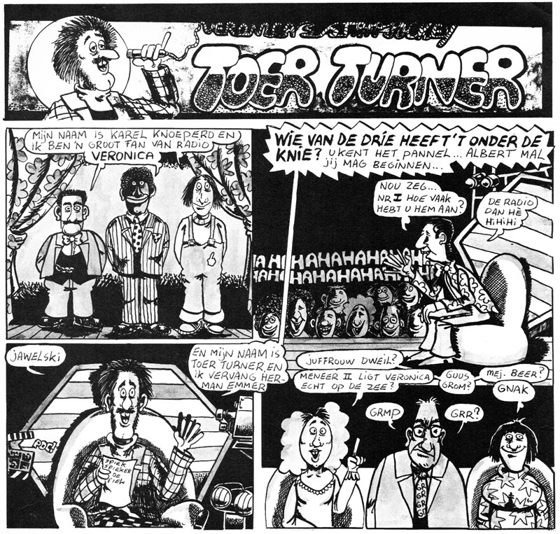 Back in the Netherlands in the late 1960s, Ruud Straatman offered his services to editor Hetty Hagebeuk of comic magazine Pep. He got the opportunity to draw a test page for a new comic by Lo Hartog van Banda, but didn't get the job. It later became a staple in Pep magazine under the title 'Baron van Tast', drawn by Jan van Haasteren. It took until 1972 before he had his first comic published, 'Toer Turner' (1972-1973) in Veronica Gids. Drawn in a style reminiscent of the underground movement, the main hero was a disc jockey on board Veronica, the ship of the eponymous offshore radio station. A planned comic about two police officers and one about Dutch comedian André van Duin for comic magazine Eppo fell through, but he did work with Eppo editor Martin Lodewijk on an advertising comic for Drum tobacco in 1976-1977. As "Ruud Schrijfman", he provided Robert van der Kroft with some gag ideas for Eppo's 'Sjors & Sjimmie' strip in 1978.
