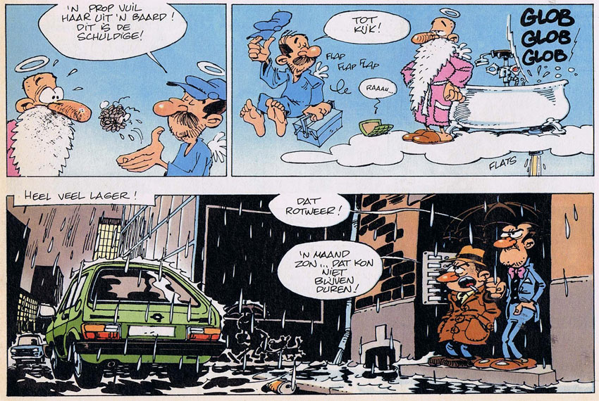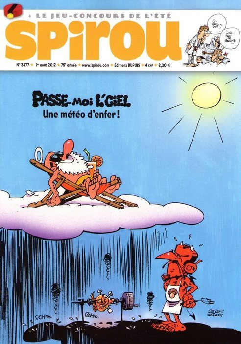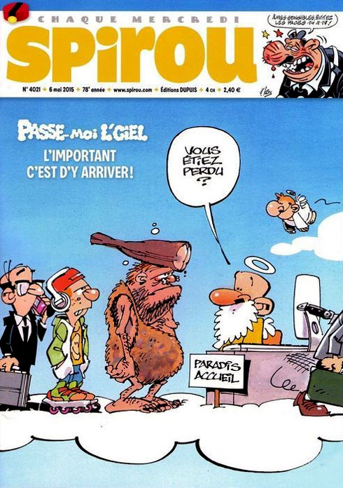 Tired of coming up with games, Stuf and Janry turned their game feature into a comic strip and changed the title to 'Passe-Moi l'Ciel' (1990-2015). The title being a pun on the expression "passez-moi le sel" ("pass me the salt") and "ciel" ("heaven"). The main setting remained Heaven, with Saint Peter as the central character. The hereafter is still treated as a hotel, with St. Peter keeping track of all new applicants by use of a computer. New about the series was that we also get a glimpse of everyday life inside Paradise. For instance, Saint Peter likes to play some pool with his friend Nestor, A.K.A. the Grim Reaper. Other gags feature the "downstairs neighbors" in Hell, who maintain a similar bureaucracy, or show the activities in the hereafters for flies, snails, elephants, mushrooms, sausages, pickles, etc., which all have their own Saint Peter. 'Passe-Moi l'Ciel' appeared on an irregular basis in Spirou between 23 May 1990 (issue #2719) and 2015, and was collected by Dupuis in seven albums between 1999 and 2015. In Dutch, it was translated as 'Oh! Lieve Hemel'.