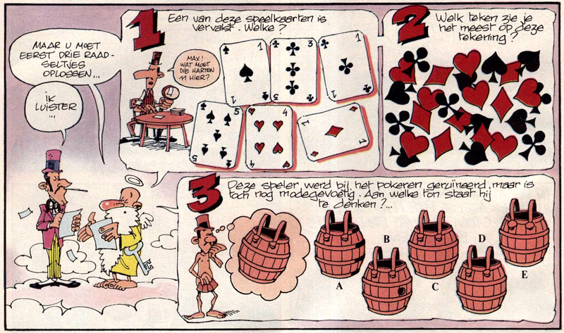 De Becker additionally made his appearance in Spirou magazine with a couple of cartoons and illustrations, which he signed with either Stuf or Staif. With Janry as his scriptwriter, he launched the game comics feature 'Jeux d'Enfer' (1988-1990) in Spirou issue #2622 (13 July 1988). Much like Tome and Janry's previous section 'Jeuréka' (1980-1981), it was a clever mix between a riddle page and a gag comic. Saint Peter who poses three questions or riddles to the dearly departed who are waiting in line for their spot in Heaven, mostly with the cause of their death prominently visible. With the right answer, one can proceed to the holy grounds, but otherwise it's a one-way ticket to Hell.