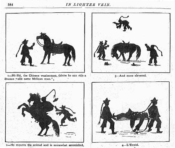 Aside from painting horses, Stull also made a few text comics depicting horses, which appeared in the humorous section 'In Lighter Vein' of the Philadelphian magazine Our Continent. They are all drawn in black silhouettes, with the narration written underneath the images. One cartoon, published on 21 March 1883 depicts a Chinese washerman trying to ride a Bronco "all same Melican man" ("like an American man"), only to be thrown off and carried away on a stretcher afterwards.