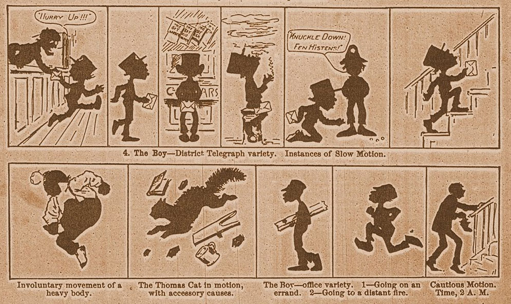 Stull's comic strip, 'Photographs of Animals in Motion', is a text comic in five parts, each told in a strip each. All strips parody Muybridge's photographs of beings in motion, with sarcastic commentary written underneath. Contrary to what the title claims, not all panels depict "animals". They are mostly a random set of funny ideas, showing certain people or animals in slow motion. In the first strip Muybridge is lampooned as "professor Abridge" who doesn't photograph a horse, but a mule. Things do not go as planned, as the donkey kicks him and his equipment away. In the next strip two boys tie a kettle to a dog's tail to watch it run away in panic, dragging the object behind him. The third strip shows a boy chopping wood for his mother, but the clock shows that even after an hour he hardly did anything. The telegram deliverer in the next strip also takes his time to bring his urgent message to his client. The narrative is interesting because Stull drew two speech balloons, which were still a novelty in comics at the time. Finally, the last strip shows an obese man getting angry, a cat creating havoc, a slow and fast moving telegram boy and a man arriving home late at night, taking his slippers off to avoid waking others up.