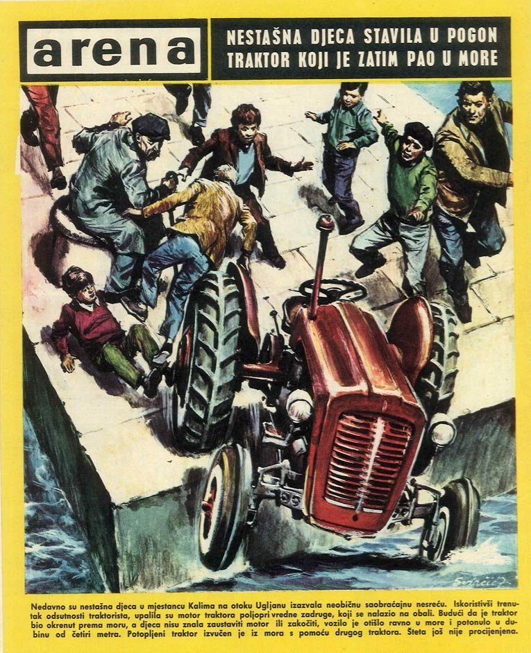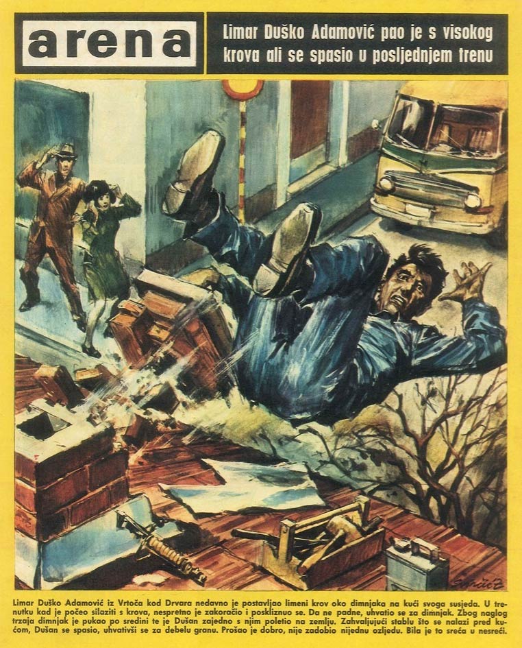 While still a student, Zdenko Svirčić had begun making illustrations in the Zagreb press. Among his early clients were publications like Student List, Kerempuhu and, most notably, the national daily newspaper Vjesnik. In his home country, this was a period with a strong focus on visual and artistic quality, and new graphic techniques emerged. Papers and magazines tried to please their readership with high quality illustrations, while artistic fields like animation, music and theater also blossomed in the Zagreb region. Starting in 1952, Svirčić served as header designer and illustrator for Vjesnik u Srijedu, a weekly magazine edited by the legendary journalist Fadil Hadžić. He remained with the weekly, which is also referred to as VUS, until 1996. In the 1960s, Svirčić also began an association with the magazine Arena, for which he made a weekly back-page chronicle of bizarre events of everyday life. Further illustration work appeared in Plavi Vjesnik (late 1960s/early 1970s) and ZOV (1970s).