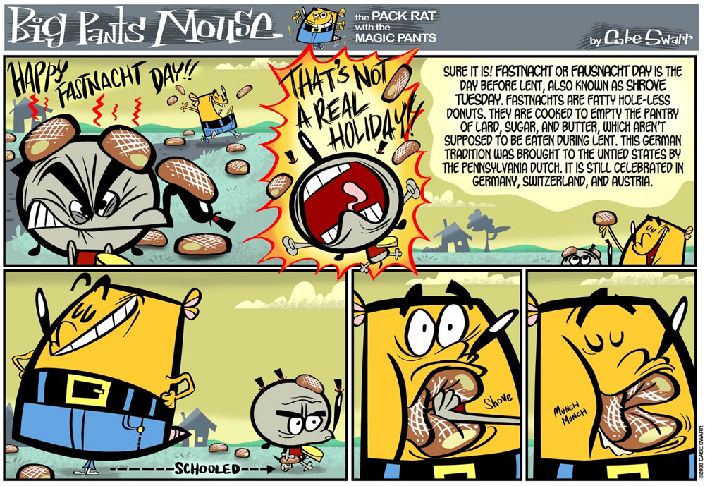 In 1998, Swarr created his own pilot for a Spümcø cartoon series, 'Big Pants Mouse'. It starred a packrat whose magic pants get him in all kinds of adventures... and trouble. The animated series never saw the light, but Swarr used the character in two comic books published in 2001 and 2002 under the Dumm Comics imprint. Between 5 May 2008 and 25 May 2010, the feature reappeared as a webcomic on the Dumm Comics website, which was launched by Swarr and a couple of friends to host webcomics created by animators from the cartoon industry.