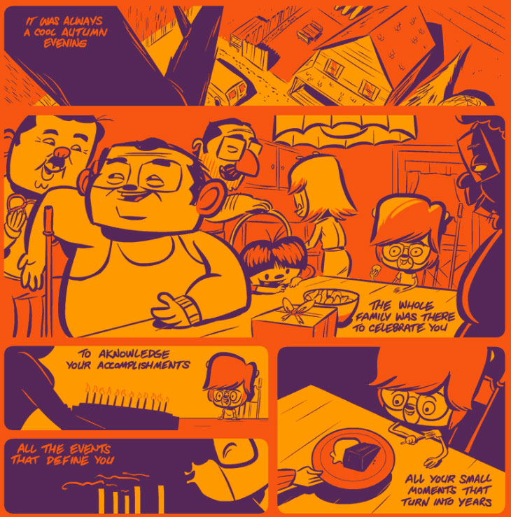 Another webcomic series by Swarr hosted on Dumm Comics was 'Life In The Analog Age' (2010-2014), inspired by his youth in Pennsylvania during the late 1970s and early 1980s. As Swarr described it, it was a "more innocent time, before digital dominance and information overload". Swarr deliberately used an orange and purple color scheme, to provide the nostalgic look of an old photograph. Yet he didn't want to resort to an ironic or sentimental look at the past, but more a recollection of how he felt and thought about things that happened to him at that age. Interviewed by Amid Amidi on the website Cartoon Brew (6 June 2013), Swarr explained: "I'm pretty sure our memories aren't just a series of remembered facts of events. When you think back and remember how things were, yes you do recall what happened, but it's not always accurate. That's because, yeah, it was a long time ago, but it's mainly because you're using how you felt at the time as a frame of reference. Our memories are wrapped up in them. That's nostalgia to me, true nostalgia, and that's a lot harder to capture than just making fun of pop culture, fashion, or how poofy hair styles were." The first episode was launched on 20 July 2010 and published on a weekly basis. 'Life in the Analog Age' was also adapted by Swarr into a web animation series and in the retro video game 'Life In The Analog Age: Rainy Day', made in the style of a 1990s Nintendo Gameboy game.