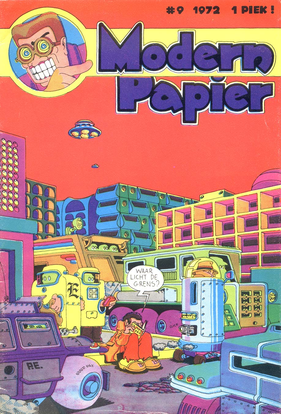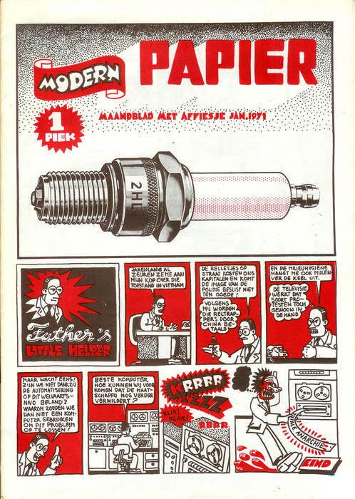 In 1969, Swarte's first comic strip 'Het Ware Verhaal van Mr. P.' was published in De Andere Krant, an alternative magazine distributed in Eindhoven. The character Mr. P is a strange man with a lightbulb-shaped nose and a dollar sign on his high hat. Swarte later reused him in his next project, his own comic magazine Modern Papier (1971-1972), for which Swarte drew one-shot stories like 'Design Dealer Presents', 'Hektor', 'Mr. P.' and 'De Bros'. Besides his own work, Modern Papier also printed work by other artists, ushering in a new generation of Dutch alternative comic creators. Among the contributors to Modern Papier were Bill Bodéwes, Rob Figee, Evert Geradts, Bob Heiligers, Ever Meulen, Peter Pontiac, Jan Schoen, Mark Smeets, Jacques Verbeek, Sander Wissing and the future filmmaker Dick Maas. Modern Papier lasted 10 issues, all self-published by Swarte, until merging with another influential underground comix magazine.