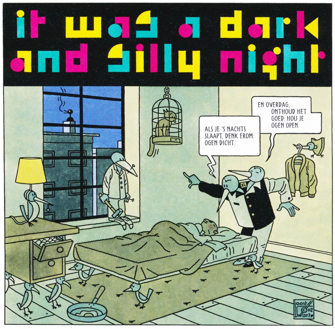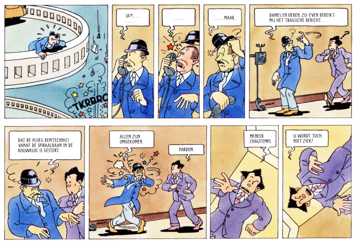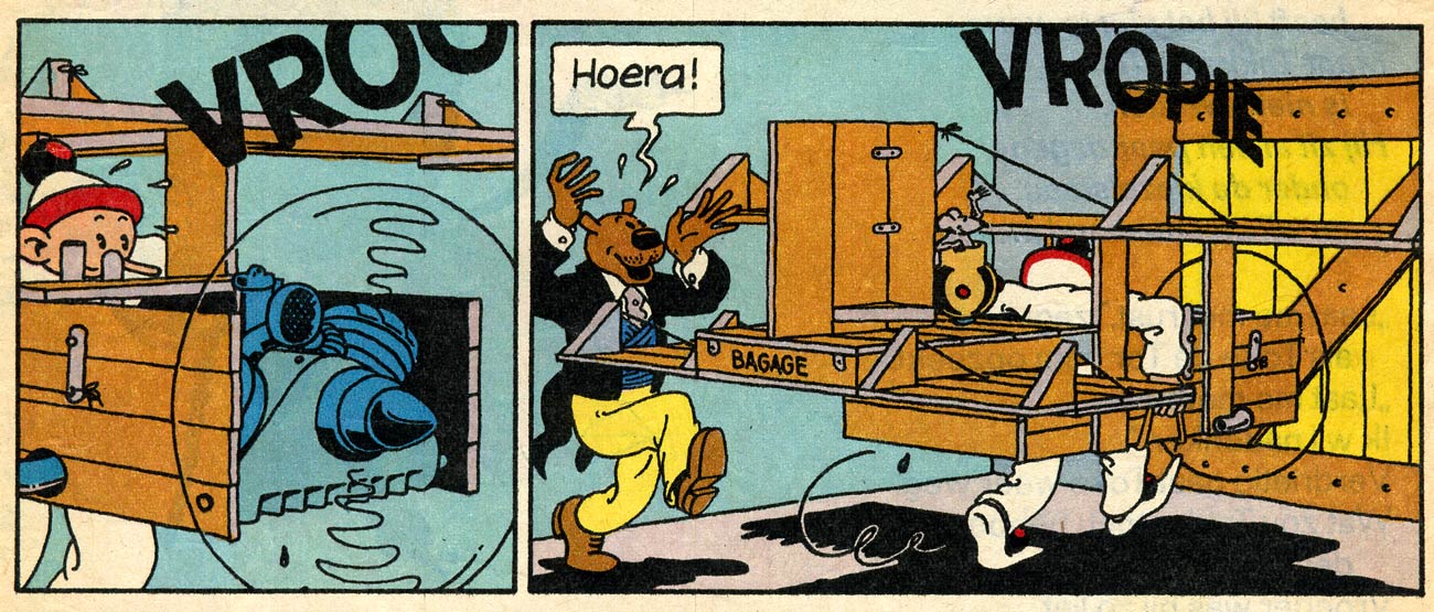 As a comic creator, Swarte has put style over story. His dialogues typically use old-fashioned Dutch, a throwback to the comics he read as a child, which often featured words and expressions he didn't understand yet. Before and directly after World War II, many comics in Dutch children's magazines were sometimes badly translated, or written by adults who didn't quite know how to write for young audiences. This resulted in stilted dialogue, with archaic language that didn't quite match the straightforward action scenes. Although young Swarte didn't get every sentence, he was so enthralled by the images that he absorbed these antiquated dialogues nevertheless. In his own comics, he aimed for the same bewildering juxtaposition between speech balloons and imagery.