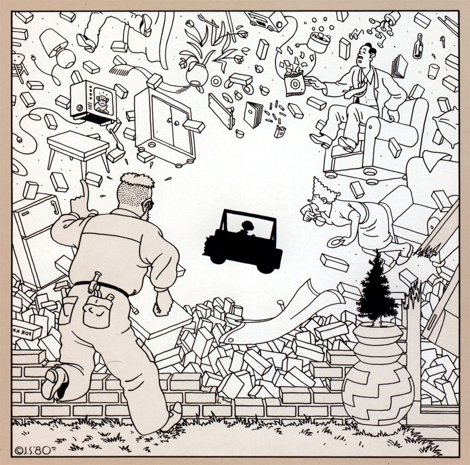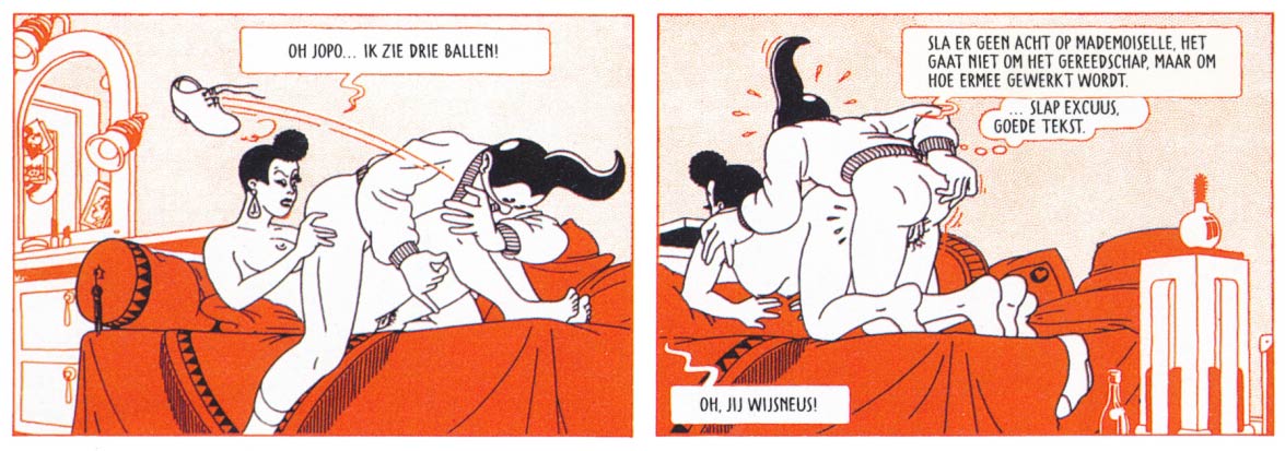 While the American underground comix movement inspired alternative artists to create autobiographical, self-reflexive comic stories with non-conformist, daring artwork, Joost Swarte instead used traditional European comics as guideline for a string of short stories and gag pages filled with sex, extreme violence and absurdities. With clean visual storytelling inspired by Hergé, Swarte created satirical takes on colonialism in the stories 'Het Wachten is op Versterking' (1972) and 'Caesar Soda? (1973), or absurd tales about a wave of suicides in the city ('Goodbye', 1977), a modern-day Tower of Babel ('Een Tweede Babel', 1986) and a Rubber Paradise for retired condoms ('Het Rubber Paradijs', 1991). Many Swarte comics breathe the atmosphere of a classic adventure story, but then with weird twists, outlandish plot developments and lack of traditional endings. On rare occasions, Swarte took a political stance, like with the comic strip 'Activo Aventura Argentina', that protested against the organization of the 1978 World Championships Football in Argentina, which was a military junta at the time.