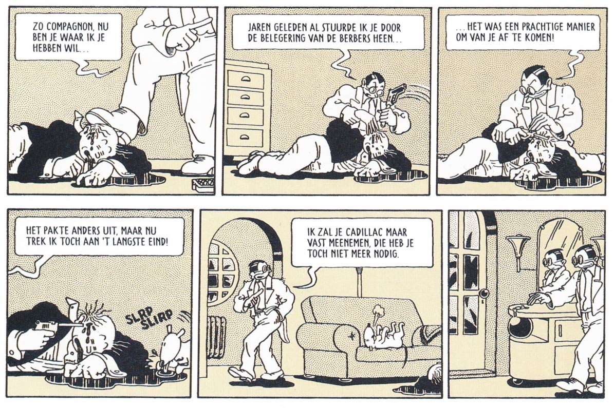 Recurring characters in Swarte's alternative comic stories are Jopo de Pojo and Anton Makassar, alongside more sporadic creations such as the Blue Berbers ('De Blauwe Berbers') and Pierre van Genderen, a stupid but sympathetic handyman, who always walks around in overalls and a beret. Swarte's most recognizable character is however Jopo de Pojo. Much like Hergé's 'Tintin', Jopo has a quiff and golf pants, though in his case his hair is black, much longer and curls backwards instead of forwards. Swarte was inspired by the faces and costumes of The Marx Brothers and felt his own character should also have a distinctive look. Apart from Tintin, Jopo also has a sign on his shirt, referencing George Herriman's 'Krazy Kat', while his face brings up comparisons with Walt Disney's Mickey Mouse and Otto Messmer's Felix the Cat. An unlucky loafer, Jopo goes on weird adventures, but often ends up on the receiving end. In one classic gag, Jopo visits a publisher to present a comic that can be read rightside up and upside down, while the actual comic he appears in himself has the same gimmick. Swarte made it as a tribute to early 20th-century comic artist Gustave Verbeck and his 'The Upside Downs of Little Lady Lovekins and Old Man Muffaroo' (1903-1905). Other episodes of Jopo are visualizations of blues lyrics.