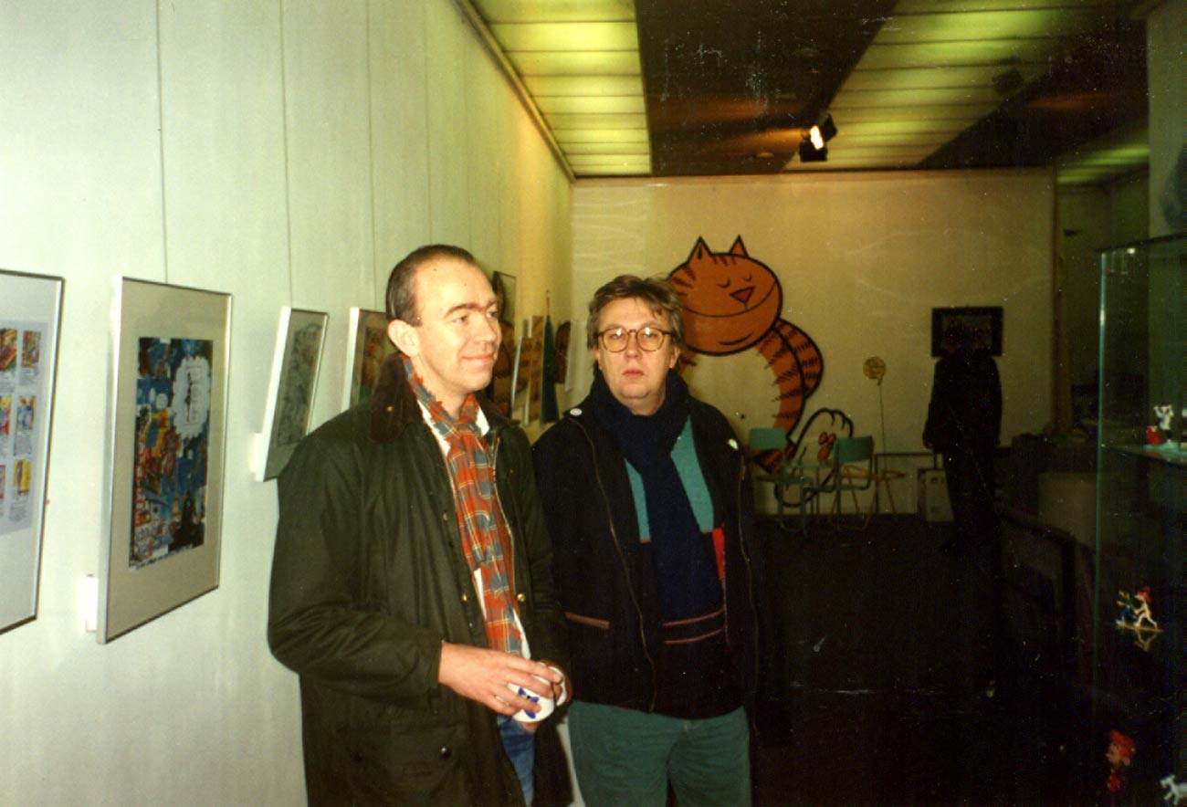 Joost Swarte and Hansje Joustra during the opening of the Joost Swarte exposition at Gallery Lambiek on 6 April 1990. The exhibition closed in May of that year.