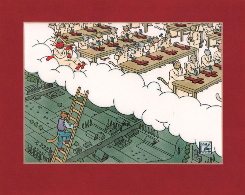 In 1972, Swarte acquired a more mainstream audience through his cover illustrations for the Malmberg school magazines Okki and Jippo. Between 1972 and 1979, these magazines also ran his comic feature 'Katoen+Pinbal' (1972-1979). Katoen is a clown in a Pierrot costume, and Pinbal his anthropomorphic pet dog. The characters are reminiscent of Max Fleischer's Koko the Clown and Bimbo the Dog. Originally, Pinbal was a little dog who walked on all fours, but Swarte later redesigned him as a human with a dog face, sharing the same size as the human characters. A third character is Zacharias the mouse, who also grew in size. In February 1977, Joost Swarte passed on the drawing pen of the feature to his friend Flip Fermin. From Swarte's script, Fermin embarked upon the serial 'Huize "Bel-Air"', but had difficulties meeting his deadlines and the story was aborted after 23 pages. Swarte then resumed drawing the comic by himself. For a while, Jan Vervoort was considered to continue 'Katoen + Pinbal', but eventually these plans fell through. 'Katoen + Pinbal' was also translated into French as 'Coton et Piston' and ran in the British children's magazine Measles under the title 'Hector and Dexter'.