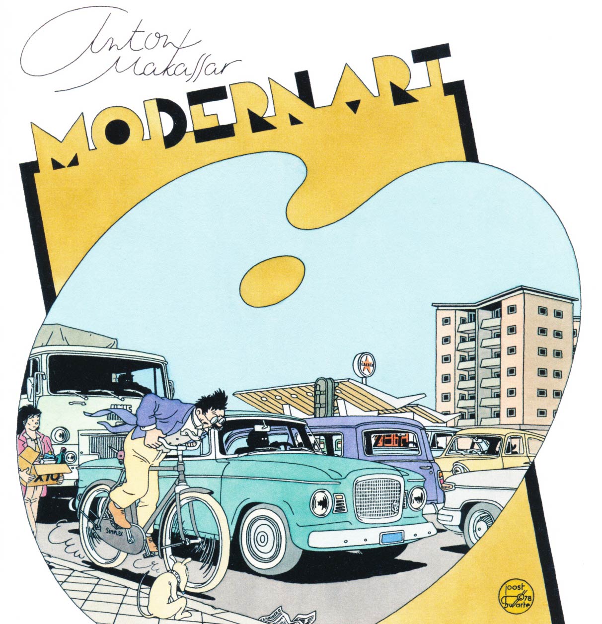 Joost Swarte is an internationally renowned Dutch graphic designer, illustrator and architect, admired for his calculated and technically precise style, with much attention to elegant designs and bright colors. In the 1970s, Swarte drew underground comix stories featuring characters like the quiffed loafer Jopo de Pojo and the failed art collector Anton Makassar, as well as the children's adventure series 'Katoen + Pinbal (1972-1979). He was (co-)founder of the influential alternative comic magazines Modern Papier (1971-1972) and Scratches (2014-2018), which helped put a spotlight on a great many talented comic creators. Swarte was additionally one of the initiators of the Dutch comic festival Stripdagen Haarlem and, with Hansje Joustra, co-founder of the publishing company Oog&Blik (1984-2010). As an avid admirer of Hergé, Joost Swarte helped with the design of the Hergé Museum in the Belgian town Louvain-La-Neuve and also coined the term "Clear Line" for the characteristic graphic style of Hergé and his followers.