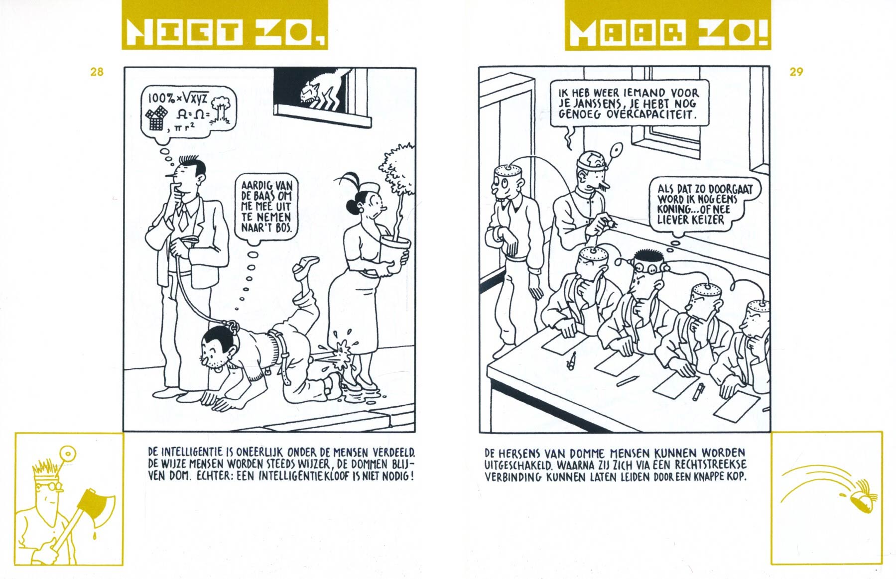 As his activities expanded to a variety of art forms, Swarte continued to work regularly for the Dutch mainstream press, most notably the opinion weekly Vrij Nederland. For this magazine's children's paper, Swarte drew the comic strip 'Dr. Ben Ciné (March 1978 - April 1980). Each episode features a doctor called Ben Ciné (whose name is a pun on the Dutch word for gasoline, "benzine"), being confronted with strange patients and other odd people coming his way. Book compilations were released in 1986, 1987 and 1991 by De Harmonie/Het Raadsel, with French translations published by Futuropolis. Also for Vrij Nederland, Swarte made the two-panel cartoon feature 'Niet Zo, Maar Zo' (1982-1990), parodying educational comics. Each gag demonstrates to readers the "bad example" of an absurd situation, as opposed to the "good example". In 1985, De Harmonie/Het Raadsel released a book compilation, translated into French by Futuropolis as 'Passi Messa' and in German by Affholderbach & Strohmann as 'Nicht so sondern so!'.