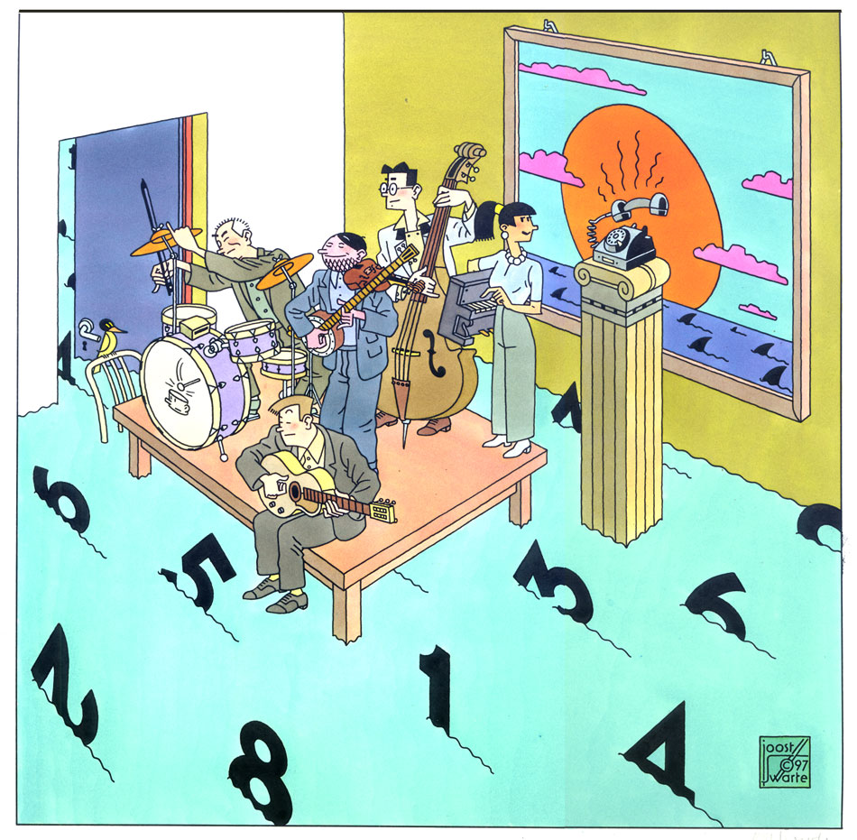 Also a big fan of music, Swarte once performed in the pop group The Shark, but after two concerts he decided that his vocals left a lot to be desired. While his own musical career was cut short, he continued to create cover illustrations for a great many musical albums, starting with The Mr. Albert Show's 1971 album 'Warm Motor'. In the late 1970s and early 1980s, he illustrated records for acts on Hansje Joustra's punk label No Fun (later Torso), including The Helmettes, Houseband, Mecano and Neon. On other punk labels, he created artwork for The Rousers and Squits. Besides punk, he illustrated the covers of blues rock compilation albums like 'Light Up The Dynamite' (1977) and 'Boem' (1996), and the 1978 Bintangs album 'Rhythm & Blues'. As an admirer of Argentine tango and latino music, he used his graphic talent to illustrate album sleeves for Tango Cuatro, Color Tango, Fuzué, Piano Con Clave, Capelino & Stéphane Grappelli, Osvaldo Pugliese & Astor Piazzolla, Sexteto Canyengue, Javier Fatta & Sexteto Canyengue, Septeto Turquino, Pascal Comelade and Eric Vaarzon Morel, as well as two volumes of the compilation album 'Lucho Collected' (1994, 1996). Joost Swarte also provided artwork for classical music, jazz & swing compilations like 'Zeit Für Liebe' (1993), 'Traveller' (1993), 'Romantics' (1993), 'Country Living' (1993), 'Sonntags-Konzert' (1993), 'Dinner By Candlelight' (1993) and 'Relaxation' (1993), as well as records by the Fra Fra Big Band, Lucas van Merwijk & His Cu-Bop City Big Band and Nueva Manteca.