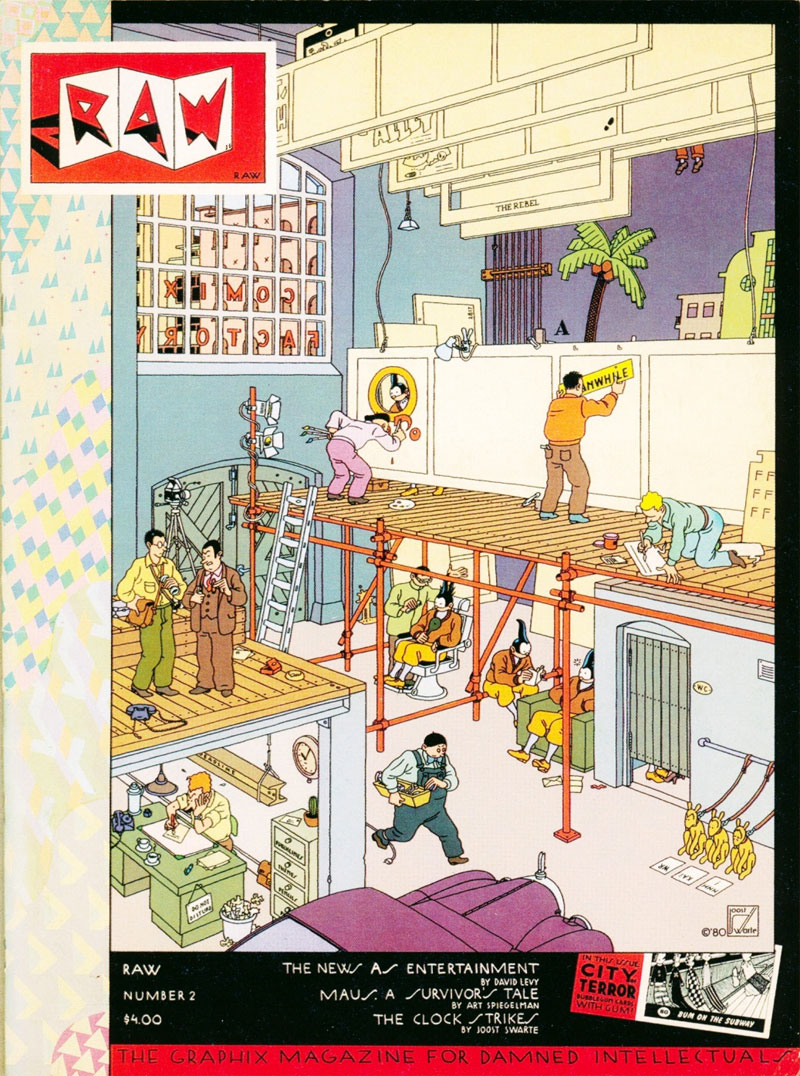 In the USA, Joost Swarte also contributed to the comic anthologies RAW and Little Lit, edited by Art Spiegelman and Françoise Mouly. Swarte received the honor to illustrate the cover of the December 1980 issue of RAW (#2), which became one of his most famous drawings. Known as "the Comics Factory", the drawing visualizes the production of a comic in the form of a cheap film company, where each panel border and speech balloon are painted against a background curtain, while a group of identical actors, one for each panel, is being prepared for the shoot. Since 2003, Joost Swarte's work is also featured in the Italian architecture magazine Abitare.