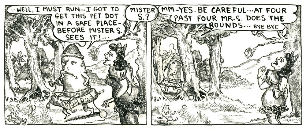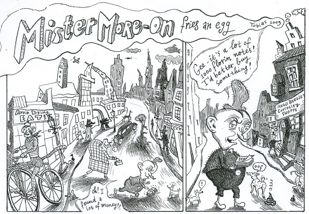 Tobias Eduard Tak, Tobi in short, was born in 1954 in Voorburg in the Dutch province South Holland. While still in high school, Tobias created the characters of Gaboon the Wizard ("Gaboen" in Dutch) and his glamorous companion Shlenzy ("Slijntje"), who both starred in adventures designed to entertain his sister Elise, his brother Marten and their friends. Tak later explained that the character had come to him in a dream, in which he saw a strange man with frog-like feet, an orange tail and a beetle's shell. He was wearing a turtleneck and strange puffy pants, while his hair looked like flames. Out of the middle flame came musical notes, which transformed into birds as they left his head. The fifteen-year old quickly sketched the character after waking up. The wizard was the first of many surreal creations which have come from the author's mind. All of Tak's comics are characterized by their dreamlike environments and creatures, which remind of the imagery in Winsor McCay's 'Little Nemo in Slumberland', John Tenniel's illustrations for Lewis Carroll's 'Alice in Wonderland' and Dr. Heinrich Hoffmann's gruesome children's story collection 'Der Struwwelpeter'. Another influence are the underground comix of Gary Panter.