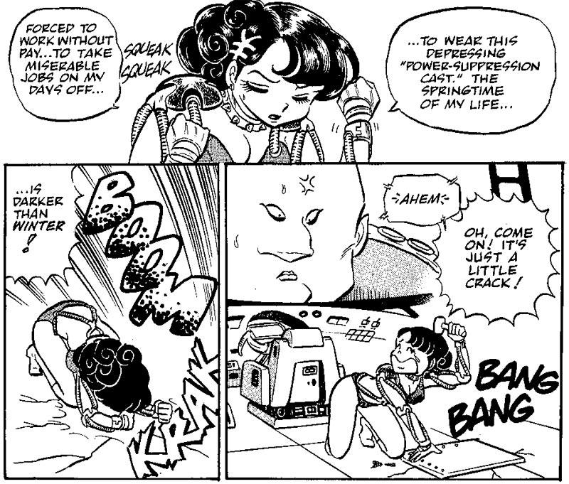 With two popular series running at the same time, Takahashi still found time to create some shorter manga stories. From 1987 on they would be collected under the title 'Rumic Theater'. Several were also adapted into the anime series 'Rumiko Takahashi Anthology' (2003). The first in line was 'Za Sūpāgyaru' (ザ・超女, 'Maris the Chojo', October 1980), a funny story about a superstrong extraterrestrial woman named Maris. While inhuman strength might seem like an advantage to most, it gives her nothing but trouble. Maris often clumsily damages things or hurts everyone in her vicinity. To avoid this she wears a harness to suppress her powers, but to little avail. She is constantly broke because she has to repay so much damage. Then a financial opportunity comes along. A billionaire is kidnapped and ransom demanded. Maris decides to find him and collect the reward. Unfortunately the kidnapper turns out to be someone with whom she has unsolved business from the past. 'Maris the Chojo' ran in Weekly Shonen Sunday and was adapted into an animated short by Studio Pierrot in 1986.