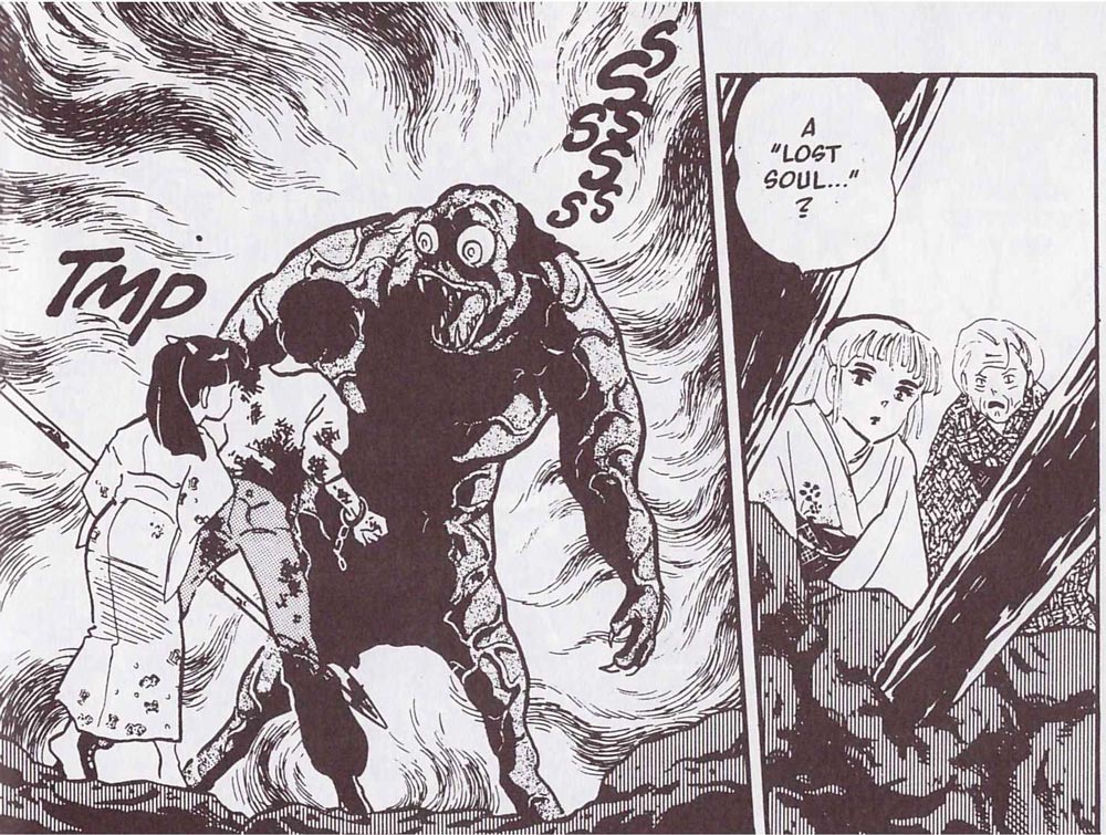 By the mid-1980s Rumiko Takahashi added a third major and long-running series to her credentials. 'Ningyo Shirīzu' (人魚シリーズ, 'Mermaid Saga', August 1984 - February 1994) took its inspiration from Japan's fascination with mermaids. According to ancient traditions eating a mermaid's flesh would grant a person eternal life. Yuuta the fisher is a mermaid-eater who suffers some bad side effects. The supercentenarian has survived all his friends and is now so lonely he wants to become mortal again. Yuuta embarks on a long journey to find a mermaid who can help him out. Along the way he meets another immortal woman, Mana, who has the same quest. Yet Mana has been sheltered all her life and is therefore somewhat unworldly. 'Mermaid Saga' is by far the darkest of Takahashi's works and reads like a horror tale. The mermaids are cannibalistic monsters who make a lot of victims. Several scenes feature gruesome killings and other horrific images. The series ran for nearly a decade in Weekly Shonen Sunday and was adapted in two animated shorts: 'Mermaid's Forest' (1991) by Takaya Mizutani and 'Mermaid's Scar' (1993) by Morio Asaka. In 2003 Tokyo Movie Shinsha adapted it into an anime TV series: 'Mermaid's Forest' (2003), which toned down some of the violence. Despite this censorship executives still took the decision to cancel the series after only 11 episodes. The remaining episodes were afterwards released direct-to-video.