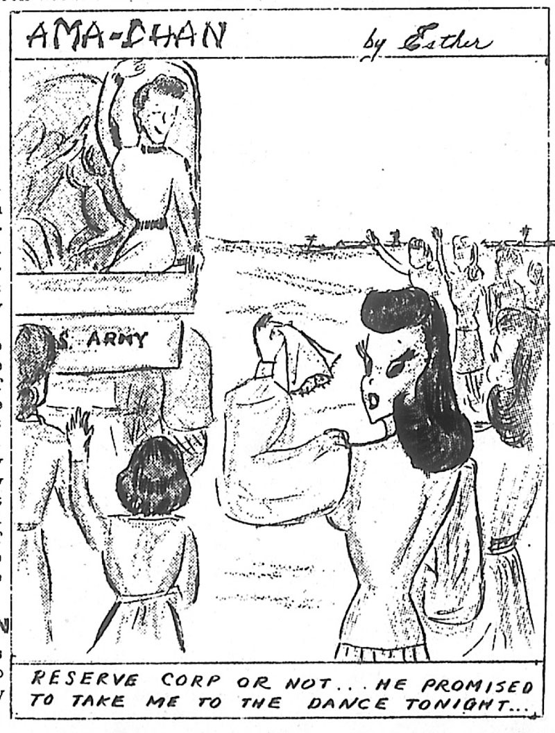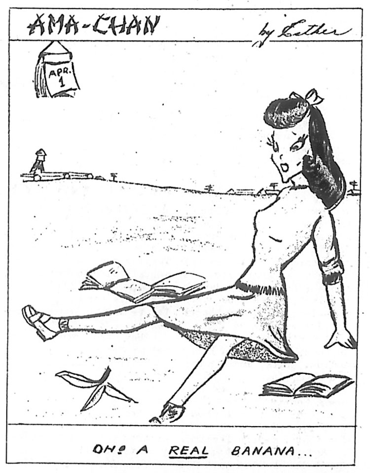 Forced to interrupt her studies, Takei worked as a waitress in the Santa Banita yellow mess hall, before she and her family were relocated to the Granada Relocation Center in Amache, Colorado. There, she was allowed to write her own column in the prison camp newspaper The Granada Pioneer. After a while, she additionally began drawing single-panel cartoons starring a young woman. She named her Ama-chan, a pun on the camp name. Only seven 'Ama-chan' cartoons were made, published between 1 April and 10 May 1944. The 18/19 year-old cartoonist signed them with her first name, "Esther". The cartoons were notable for two reasons. First because Takei, along with Rosie Arima, was one of the few female Japanese-American cartoonists in these U.S. concentration camps. Secondly because the jokes featured a lot of sexual innuendo, unlike the other comics and cartoons printed in these papers.