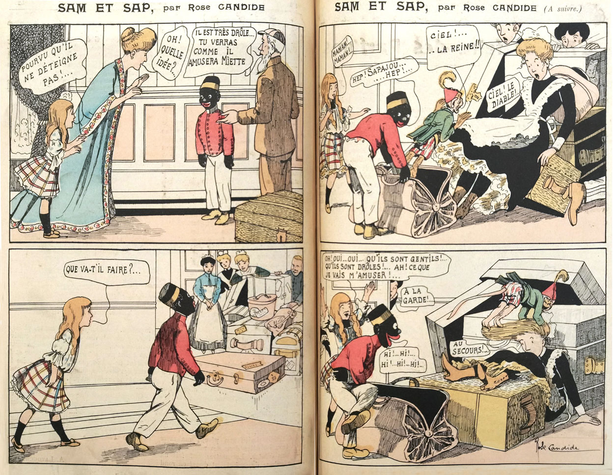 Émile Tap is also believed to be the artist Rose Candide, a signature first appearing in 1903 in the magazines published by Offenstadt. With this pen name, he illustrated fairy tales by Charles Perrault (in Polichinelle magazine), but also picture stories for children's magazines. A notable story credited to Rose Candide was 'Sam et Sap: Aventures Surprenantes d'un Petit Nègre et de son Singe' ("Sam and Sap: Surprising Adventures of a Little Negro and his Monkey"), first serialized in the magazine Saint-Nicolas and then published in book format by Éditions Delagrave in 1908. Written by G. Le Cordier, the story was a product of its time. Created long before the decolonization of France, 'Sam et Sap' told the adventures of the black bellboy Sam and his talking monkey Sapajou, who join the service of a wealthy white family. Unfamiliar with the customs of the middle-class, the two engage in a sequence of clumsy acts.  As with most early 20th-century comics about "uncivilized funny foreigners", the comedy nowadays comes across as racially offensive. Sam and Sap are unable to speak standard French and thus talk in African pidgin slang.