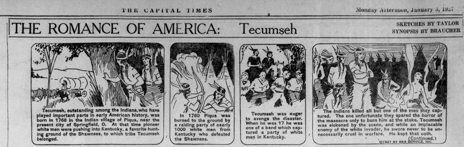 For the NEA, Taylor additionally drew installments for the educational picture story series 'The Romance of America', which presented illustrated biographies of important people from US history. Written by Bill Braucher, Taylor illustrated the serials about Tecumseh (3-8 January 1927), Kit Carson (10-22 January 1927) and Nathan Forest (24 January - 5 February 1927). Other artists for the feature were Larry Redner, Paul Kroesen and Phil V. Bessey.