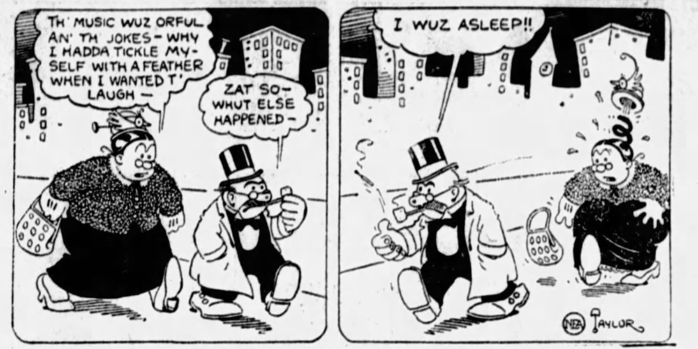 Taylor's main feature for the NEA syndicate was a family gag comic called 'Mom 'n Pop' (also appearing under the titles 'Chick and Gladys' or 'Newfangles'), which made its debut as a daily on 19 February 1924. A Sunday comic was added on 26 September 1926, and appeared as a topper to Neg Cochran's 'Out Our Way' feature. The comic starred a middle-aged couple and their kids, who all talk in slang. Pop, with pipe and top hat, had earned his fortune in the oil business, but it is actually Mom who is the boss in the household. The children include son Chick, who is just out of high school, the little kid sister Amy and the soon-to-be-graduated flapper girl sister Dot.
