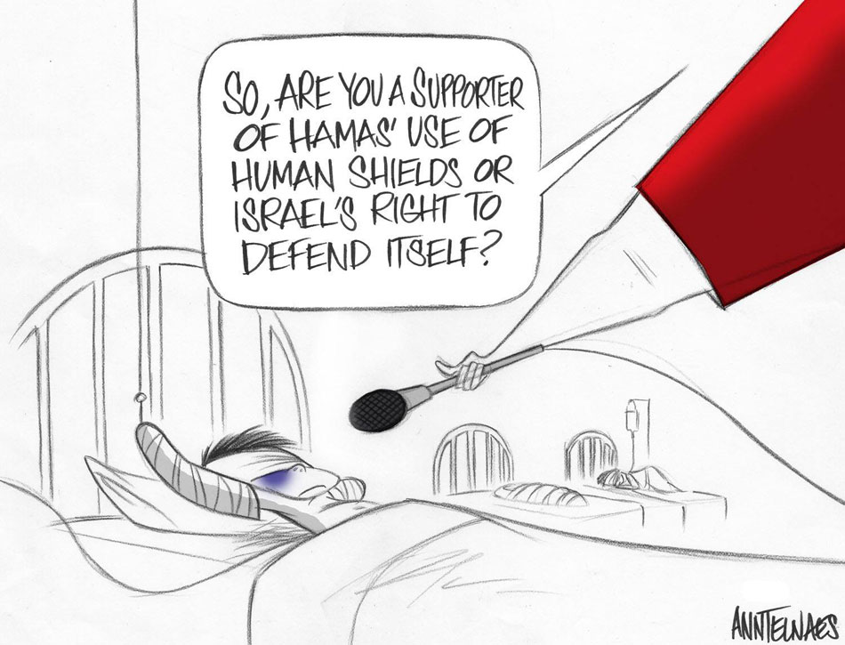 Several of her colleagues expressed their solidarity by making their own variations on the contested cartoon. Among them were Pat Bagley, Barry Blitt, Daniel Boris, Steve Brodner, Alexandra Bowman, André Carrilho, Patrick Chappatte, Jason Chatfield, Emma Cook, Liza Donnelly, Clay Jones, Kevin Kallaugher, Michel Kichka, Pierre Kroll, Daniel Murphy, Nancy Ohanian, Ramsés, Tjeerd Royaards, Jen Sorensen, Stellina, Sage Stossel, Kenny Tosh, Wes Tyrell, Nicolas Vadot, Dave Whamond and Zapiro. In a form of poetic justice, a few months later Telnaes won the Pulitzer Prize for Editorial Cartooning for the exact cartoon rejected by the Washington Post.