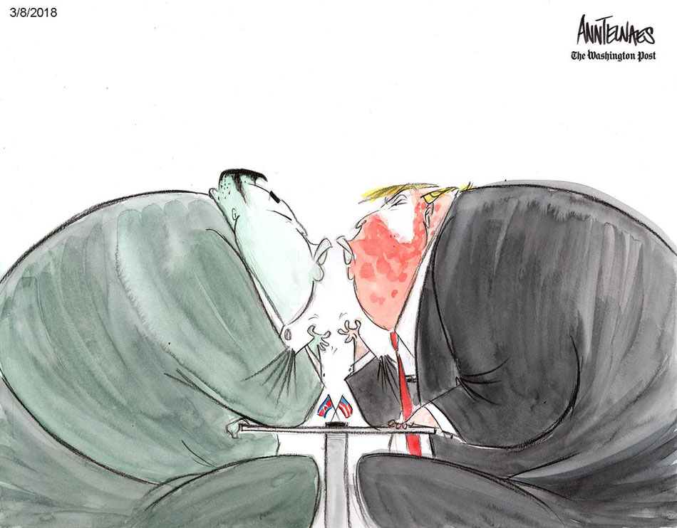 Cartoon by Ann Telnaes, depicting North Korean dictator Kim Jong-Un and U.S. president Donald Trump, 8 March 2018.