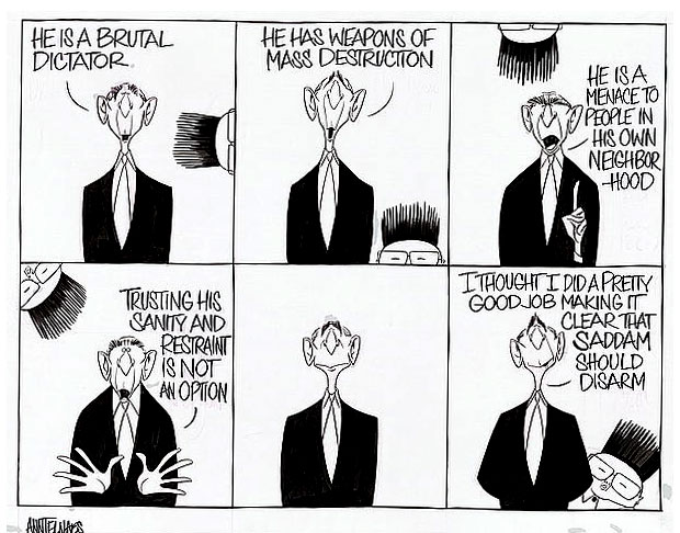 Sequential cartoon by Ann Telnaes (3 February 2003). U.S. President George Bush Jr. is fixated on Iraqi president Saddam Hussein, but doesn't notice Kim Jong-Il, dictator of North Korea, who actually has access to weapons of mass destruction.