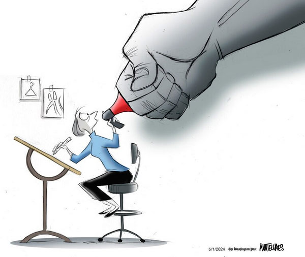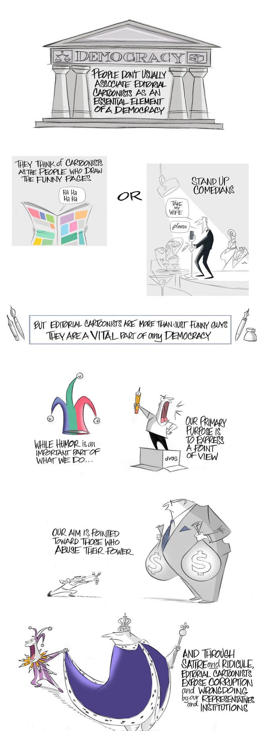 Scene from a graphic essay by Ann Telnaes, originally created in 2019 for the Bertelsman Foundation, explaining the history, value and necessity of editorial cartoons.