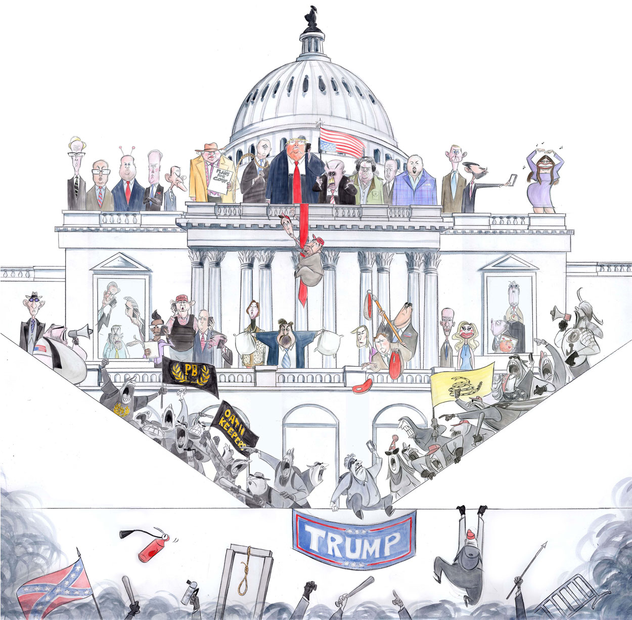 Contrary to many other editorial cartoonists, Telnaes is part of an older tradition of critical graphic commentary. Rather than just draw jokes about current events, she wants to strike up debate. Telnaes also distances herself from typical cartoonist clichés, like writing names of politicians, parties or abstract concepts on their bodies or beneath their feet. Readers have to follow the news closely to recognize all her caricatures and understand the allusions. A prime example was her iconic 'Interactive Analysis of the January 6 Insurrection' cartoon (4 January 2022). After Donald Trump was defeated in the 2020 presidential elections, he denied and even contested the election results for months, leading to an escalation on 6 January 2021, when he riled up a huge crowd of his supporters to storm the U.S. Capitol and keep him in power. The event shocked millions of people, and received condemnation from many, including prominent U.S. Republicans. The uprising caused a lot of vandalism and injuries, with a few people getting killed. Telnaes' 'Interactive Analysis' cartoon depicted Trump, various party members and convicted attackers.