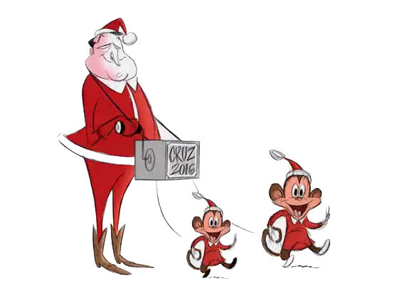 Cartoon mocking U.S. senator Ted Cruz exploiting his children for a politicized Christmas-themed propaganda TV ad, 22 December 2015.