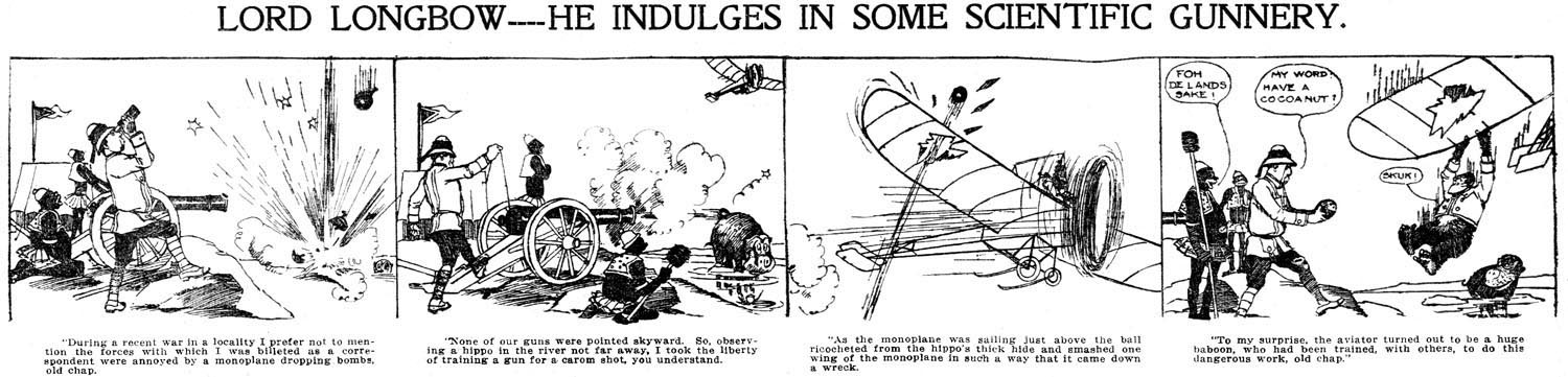 Richard J. Thain was an early 20th-century staff cartoonist with the Chicago Daily News. Besides filling in on other cartoonist's features, he also created his own strip, 'Lord Longbow' (1907-1915). The humorous stories of the unreliable narrator Longbow was his longest-running series and continued by other cartoonists who filled in for him as well as after he left the strip.