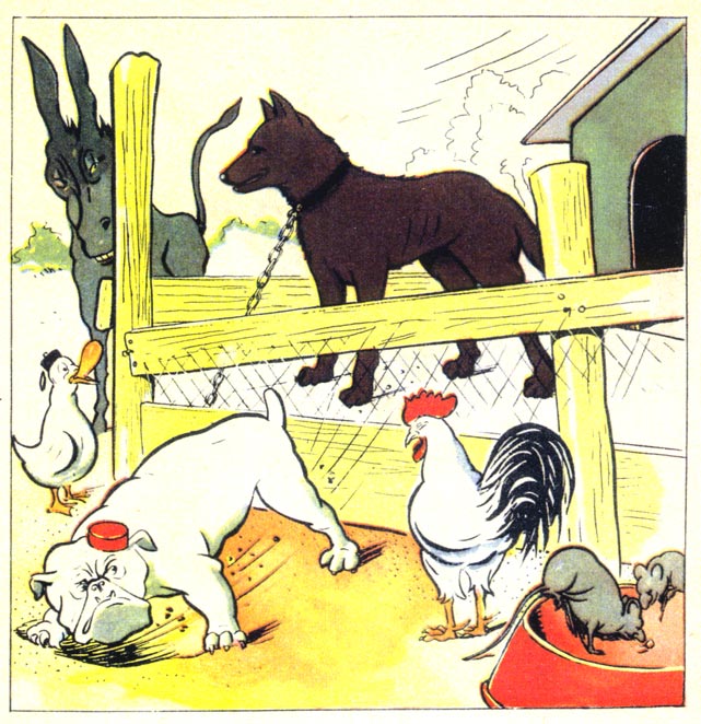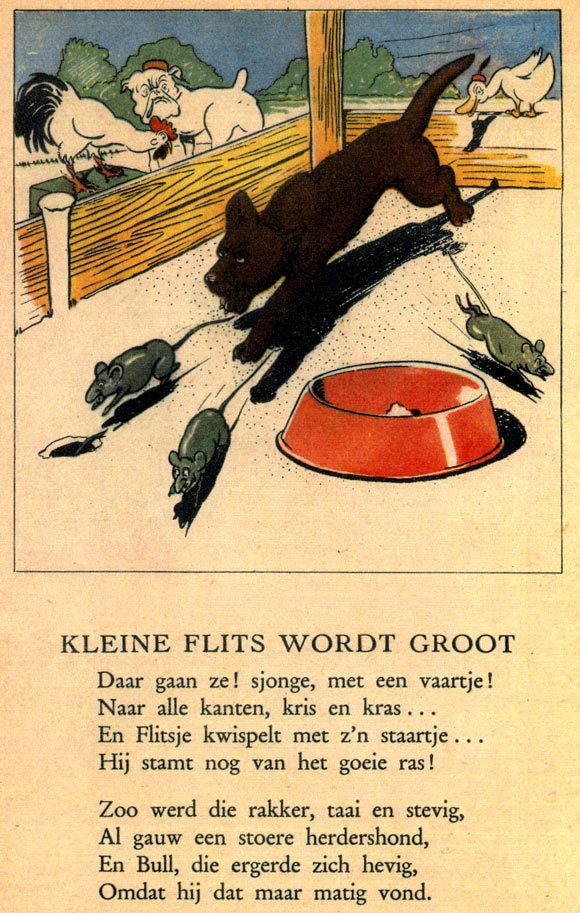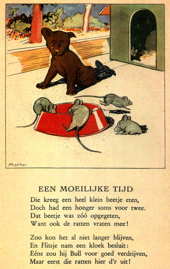 Under the pseudonym Matho, Thomassen drew the antisemitic propaganda booklet 'De Avonturen van Flits, de Herder en Bull, de Dog' (1943). The picture story was an allegory of the First World War and the build-up to the Second, portraying the major players as animals. The color drawings were accompanied by text captions in rhyme. Adolf Hitler is depicted as the caged German shepherd (Little) Flits, whose bowl is eaten empty by hook-nosed rats, shamelessly referring to the Jewish population. Flits is determined to break free, but is forced back by the English bulldog (Winston Churchill), the French goose and the American donkey. The booklet ends with Flits deciding to take on the battle... A second volume was announced, but never appeared.