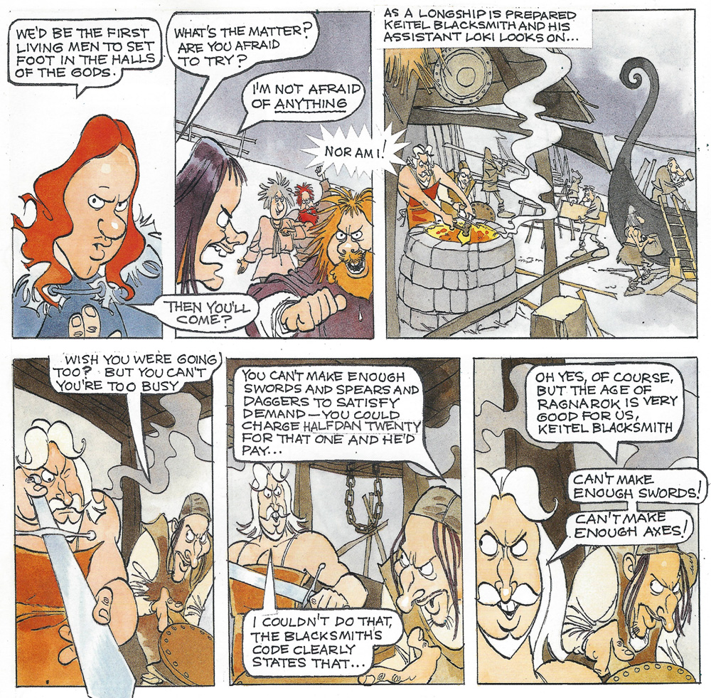 More than a decade later, Monty Python comedian and director Terry Jones directed 'Erik the Viking' (1989), a film loosely based on his own fantasy novel of the same name. The picture stars Tim Robbins and Eartha Kitt, Mickey Rooney, John Cleese, Neil Innes and Terry Jones in smaller roles. At the time, the film wasn't a huge success, mostly because many people incorrectly assumed it was a Monty Python film, solely because of the presence of Jones and Cleese. Thompson adapted this movie into a comic book as well, published by Robson Books.