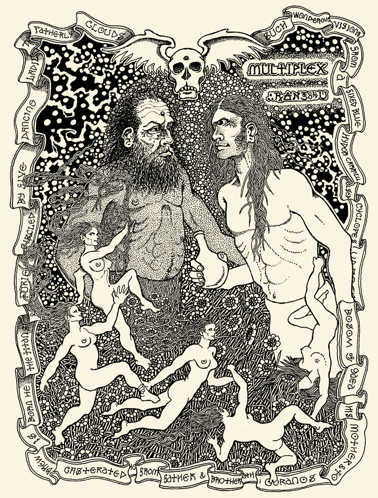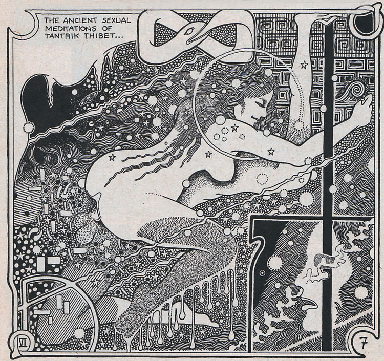 Although it's easy to see why Thompson's work appealed to fans of 1960s psychedelic and underground art, he was somewhat of an outsider. For starters, he was very critical on how people used hallucinogenic drugs as a path to "seek wisdom" or simply stare at his work. In conversation with Scott Jeffery, published on nthmind.wordpres.com on 14 August 2012, the artist explained: "Personally, I see problems with psychedelics being used recreationally. The alterations in the thought processes and mood patterns in many people using them can have problematic effects, such as 'poor judgment'. Users can 'believe' ideas, but just because one believes something doesn't make it true." Thompson added that whenever he read or talked with people who were frequent drug users, their spiritual "insights" in the world didn't seem as profound to him as what he had read in the Gospels, the Sutras or Taoism. He felt they often came up with subjective opinions, which constantly changed. Thompson also observed how some people he once had interesting conversations with, like the poet Allen Ginsberg, gradually suffered a mental decline because of their frequent drug abuse. In the same way, Thompson disliked the very degrading, violent and sexist ways women were depicted in most underground comix. As early as 1968, he wrote a critical review of a certain issue of Zap Comix for The San Francisco Express Times, concerning the matter. Thompson also depicted nude women and sex in his art, but in a more graceful, positive and uplifting way. To him, eroticism suggests a tantric and cosmic connection with the world, mind and eternity. As such, his work has more in common with the Kama Sutra than a pornographic book aiming for thrills.