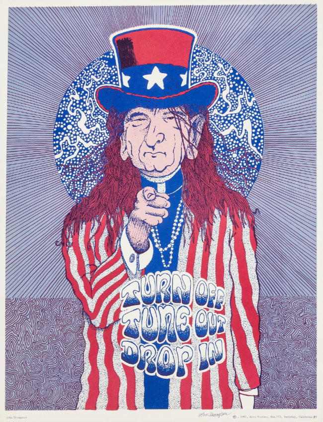 Between 1967 and 1973, Thompson was an artist/writer with the Underground Press Syndicate, a network of countercultural magazines and newspapers. He also specialized in poster art. Like many artists at the time, he was thrilled by Robert Crumb's comics and personally made sure some of them were reprinted in The Berkeley Barb. When he learned that Crumb had recently moved to San Francisco, Thompson got the idea of creating his own underground magazine (which eventually became Yellow Dog) and asked him to provide some artwork. Crumb was familiar with Thompson's poster work and they met a couple of times. He later told Thompson that the cyclops-eyed rock guitarist (James Gurley) he drew on the cover of Janis Joplin's album 'Cheap Thrills' (1968) was inspired by similar cyclops in Thompson's artwork. Thompson himself also designed promotional artwork for rock bands, such as a poster for a 24-25-26 May 1968 festival in Avalon, California. Many of his psychedelic posters were distributed by The Print Mint or Astro Posters.