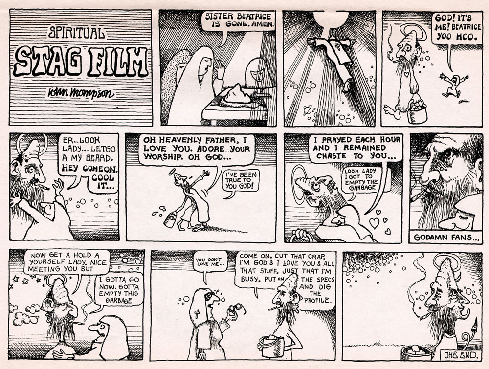 One notable celebrity fan of John Thompson's art was Robert Anton Wilson, the future author of the cult novel 'Illuminatus!' (co-written with Robert Shea, 1975). In 1978, Thompson illustrated Wilson's book 'Cosmic Trigger: Final Secret of the Illuminati' (And/Or Press, 1977). Several images were reused from comics he had made in the 1960s. In 1998, John Thompson wrote an homage to Robert Crumb in Monte Beauchamp's book 'The Life and Times of R. Crumb'. He also wrote 'The Secret History of Carmel' (Barnes & Noble, 2011), a book about the history of his birth city and its once rich native culture. It was serialized in Coast Weekly between 1989 and 1990.