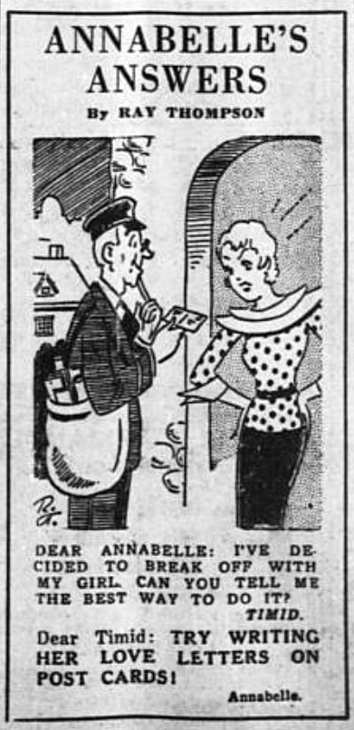 Between 1932 and 1934, Thompson assisted A.E. Hayward on 'Somebody's Stenog' for the Ledger Syndicate, and created newspaper strips like 'Annabelle's Answers' (Ledger, 1934), 'Your Dreams' (George Matthew Adams Syndicate) and 'Doodle Bug-Heads' (Philadelphia Bulletin).
